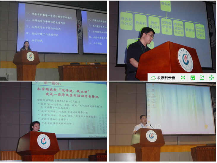 上午的会议上,张正副主任首先介绍了本科教学工作水平评估的工作内容及方式,同时详细介绍了学校评建工作开展情况以及我校办学特色。她指出教学评估在推动学校明确办学指导思想、深化教学改革、加强教学建设、完善内部质量保障体系方面有着重大意义,同时,她强调"评估"本质是"建设",因此学生才是评估的实际受益者。然后李建国科长从13个方面向学生介绍了我校教学管理工作概况,其中包括教学管理组织系统、实践教学、教学质量监控等。接下来林彬处长分两大方面介绍了学校学生管理情况,一是迎评促建,建设一流学风系列活动的开展情况,二是学生工作基本情况,其中包括学生党团组织建设、校园文化建设情况、全校奖、贷、助困工作、心理健康教育工作以及近年学校招生、毕业生就业情况等。温祥彬副书记则向同学们介绍了学生组织工作纪律和工作要求。最后,马定科校长助理作总结讲话,他强调评估工作的重要性,并且就本科教学评估学风建设向学生们提出要求,要建立学风建设的长效机制,做好全校学生的学风督察,以良好的学风迎接专家组对我校的检查。