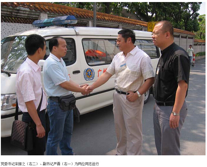 5月14日下午,带着全省人民的重托,由广东省政府组织的全省各大医院60多辆救护车通过火车运载,浩浩荡荡奔赴地震灾区——四川。 今天上午我院接到省卫生厅的紧急通知,急需我院派一辆救护车、2名司机、两个担架,在下午1点赶到火车东站。院领导宋振之、樊粤光紧急召集车队在较短的时间内安排了郭拔升、邱良裕二位年青司机参加这次救援行动。 郭拔升、邱良裕同志带着全院职工的希望奔赴灾区为灾区人民奉献我们的爱心,祝二位同志胜利归来。