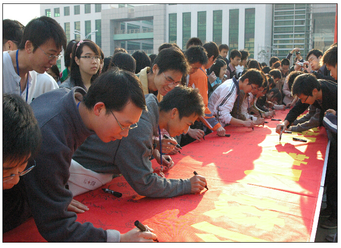 学校徐志伟校长为学生督察队授旗后,校领导带头在"Beat365中文官方网站争创一流学风、教风、校风"签名红绸上庄严签名,接着参会的上万名师生员工陆续签名,拉开了我校"争创一流学风、教风、校风"活动的序幕。本次活动将维持3个多月,期间将举办包括师德宣传教育活动、学风建设活动在内的一系列活动,在广大教师中通过深入学习胡锦涛总书记在接见全国道德模范及在全国优秀教师座谈会上发表的重要讲话,开展"师德建设"征文、"师德标兵"、"师德建设先进集体"评选、"师德师风"建设演讲比赛等活动,在全校掀起学先进模范、树文明风尚的热潮,大力倡导"爱岗敬业、关爱学生;刻苦钻研、严谨笃学;勇于创新、奋发进取;淡泊名利、志存高远"的师德风尚,增强教师的光荣感、责任感和使命感,激发教师崇教厚德、教书育人的热情,形成 "爱国敬业、笃学育人,与时俱进"的教风;在广大同学中通过开展多种形式的学风教育活动,促进校园文明建设、学风考风建设、宿舍文化建设、校园文化建设,引导学生内强素质,外塑形象,形成良好的学习氛围,养成文明的行为习惯和健康的生活方式,努力提高思想政治素质、道德水平和个人综合素质,全面营造文明、健康、团结、和谐的校园氛围。