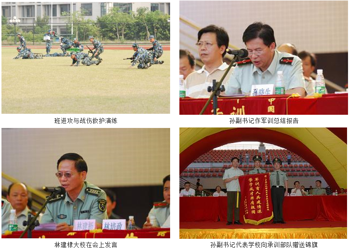 2007年9月21日下午, 2007级新生军训阅兵暨总结大会在我校大学城校区体育场隆重举行。学校党委孙晓生副书记,陈英华副校长,林培政副校长,广东省教育厅体卫艺处侯波科长,中国人民解放军军事体育进修学院士官系主任林建棣大校,三大队政委徐兆安中校,军务科康天东少校,军训团团长敬泽龙少校,军训团政委谢湘军少校,省内兄弟院校武装部领导以及学校军训领导小组成员等领导出席大会。大会由学校武装部梁沛华部长主持。