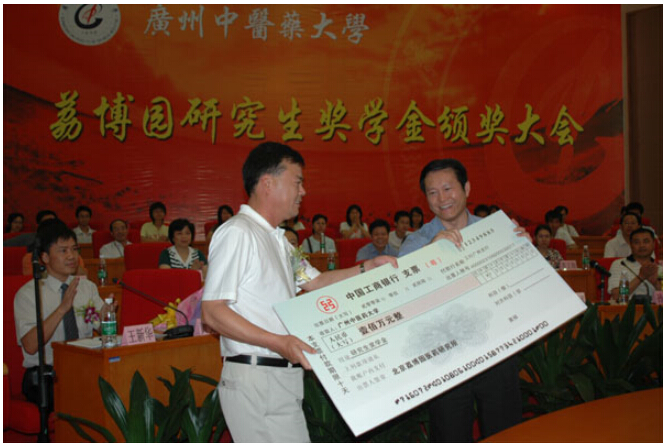 2007年5月26日,在学校圆形会议举行了首届Beat365中文官方网站"荔博园研究生奖学金"颁奖大会。国家中医药管理局吴刚副局长、国家中医药管理局机关服务局孙涛局长、荔博园医药研究所董事长黄文峰先生,学校党委黄斌书记、校长徐志伟、党委副书记孙晓生、副校长王新华及校办、财务处和各二级单位领导出席了颁奖大会,并为获得奖励和资助的22名贫困优秀研究生颁发了奖状和资助金。