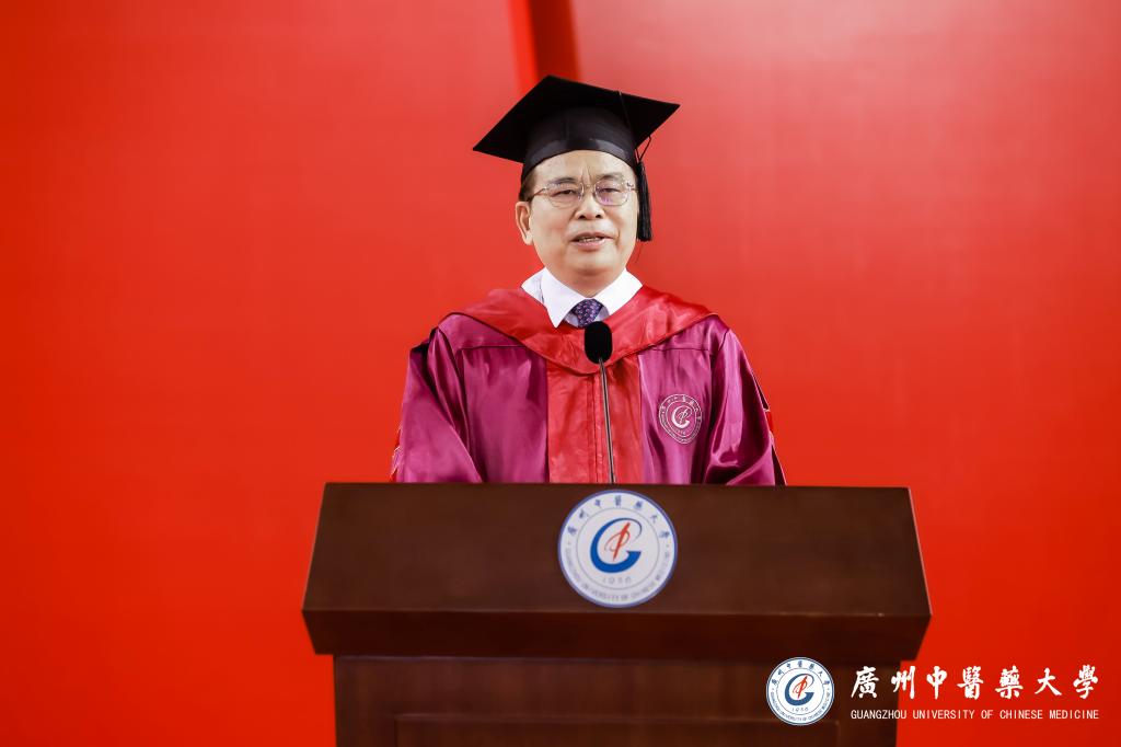 校长王伟以《胸怀“远志”,背挺“龙骨”,奋进当“苁蓉”》为主题发表致辞,带领学子们回顾了在校期间亲身经历的学校建设发展成就,并为学子们送上一份“路路通”锦囊,勉励莘莘学子怀揣远大志向,奋斗奔赴远方。他勉励同学们要胸怀“远志”奔前程,躬身于滚滚潮流之中,始终心怀“国之大者”,把爱国之情、强国之志、报国之行统一起来,把个人的理想追求融入党和国家事业之中,于每个平凡岗位中勤耕深种,在祖国的广阔舞台施展才干、实现梦想。他寄语同学们要背挺“龙骨”有担当,以实现中华民族伟大复兴为己任,增强做中国人的志气、骨气、底气,坚定中医药文化自信,把握中医药振兴发展天时地利人和的大好时机,昂首向前,守正创新,努力讲好中医药故事、传播中医药文化、展示中医药文化魅力,为推进健康中国建设和增进人民健康福祉作出新的更大贡献。他鼓励同学们要砥砺奋进当“苁蓉”,坚定信仰、信念、信心,面对困难挫折愈挫愈奋、愈战愈勇;培养创新意识,善于发现问题,敢于提出问题,努力解决问题,扩大认知地图,不断创新;勇于实践,将书本理论融入实践,在反复实践中总结经验,寻找规律,提升个人能力和素质,提高专业技能,更好为人民服务。他代表学校殷殷叮嘱毕业学子:“你们永远是广中医视如珍宝的孩子,母校永远都在这里,满怀期待与祝福,欢迎学子们常回家看看!”