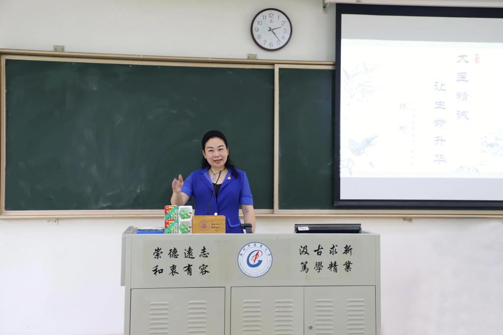 林彬带领同学们朗读《大医精诚》片段,并通过生动感人的例子讲述中国医史里的大医精诚、近代医家的大医精诚以及抗疫斗争中的大医精诚,引导同学们树立正确的道德观和价值观。第一,激发生命活力,提升人生价值。要求同学们培养健全的人格、练就健康的体魄、做好学业规划和生涯规划;第二,厚植家国情怀,砥砺奋斗担当。要求同学们将个人的前途命运和国家民族的命运紧密联系在一起;第三,弘扬传统文化,注入奋发活力。要求同学们进一步增强民族自信心和自豪感。
