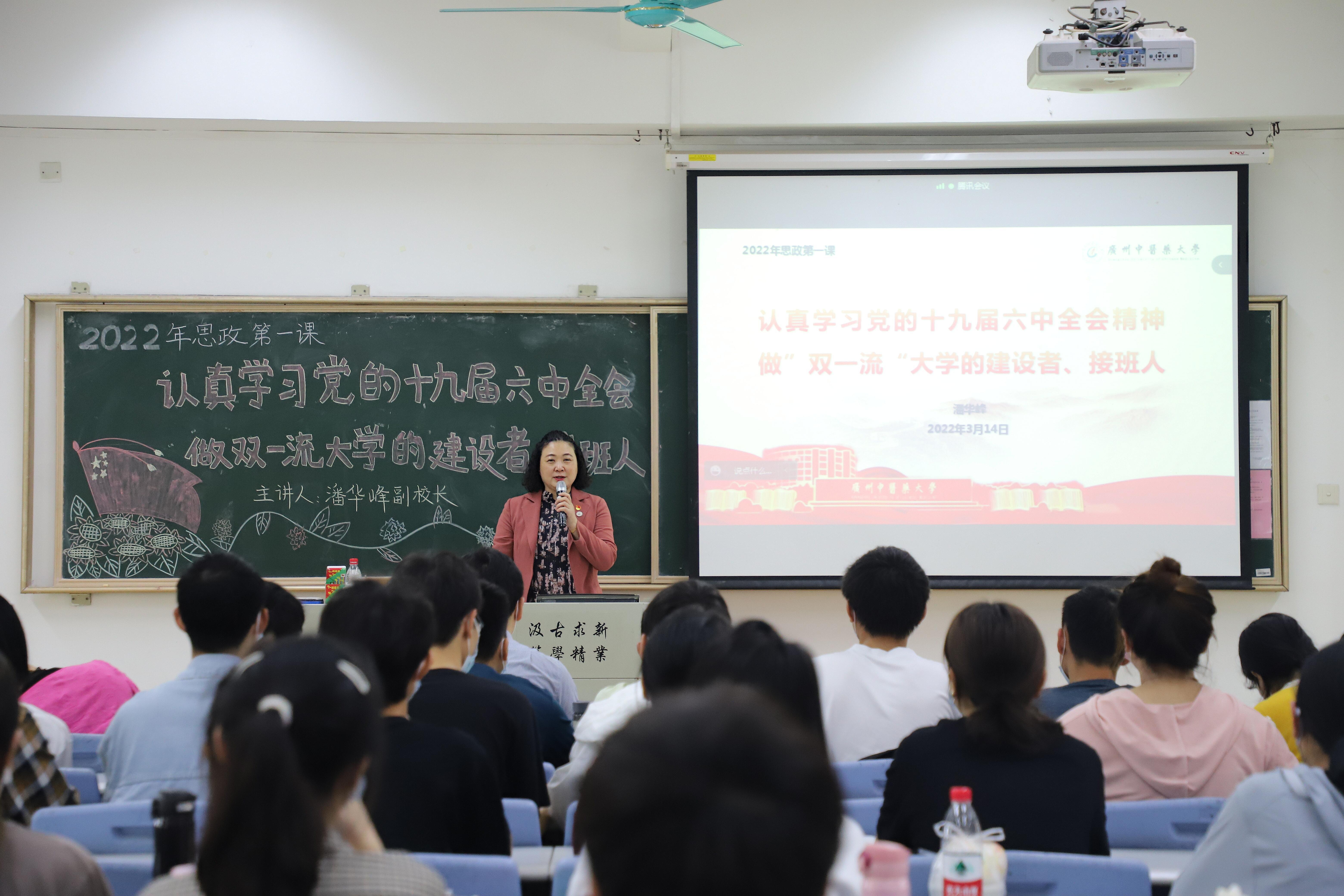 2022年3月14日上午,副校长潘华峰以“认真学习党的十九届六中全会精神,做双一流大学的建设者、接班人”为题,为所联系的班级2021级健康服务与管理学生上思政课,勉励同学要秉持中国人的志气、骨气、底气,勤奋学习、刻苦铭心、求真务实,努力成为中医药文化事业传承与发展的创新人才。在新学期,要求同学们高度重视疫情防控,克服困难,确保高质量完成各项学习任务,为学校新一轮“双一流”和高水平大学建设做出努力。