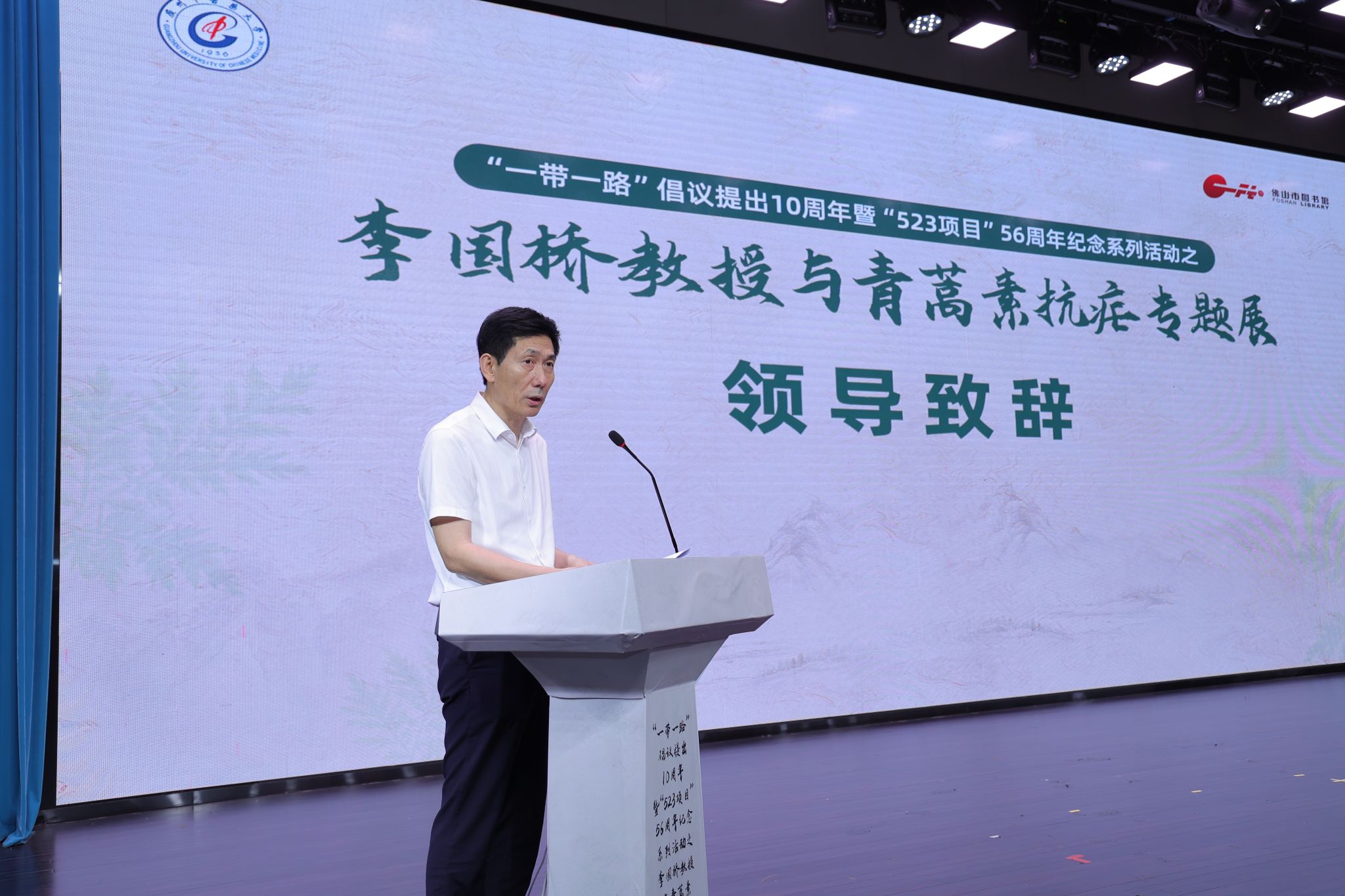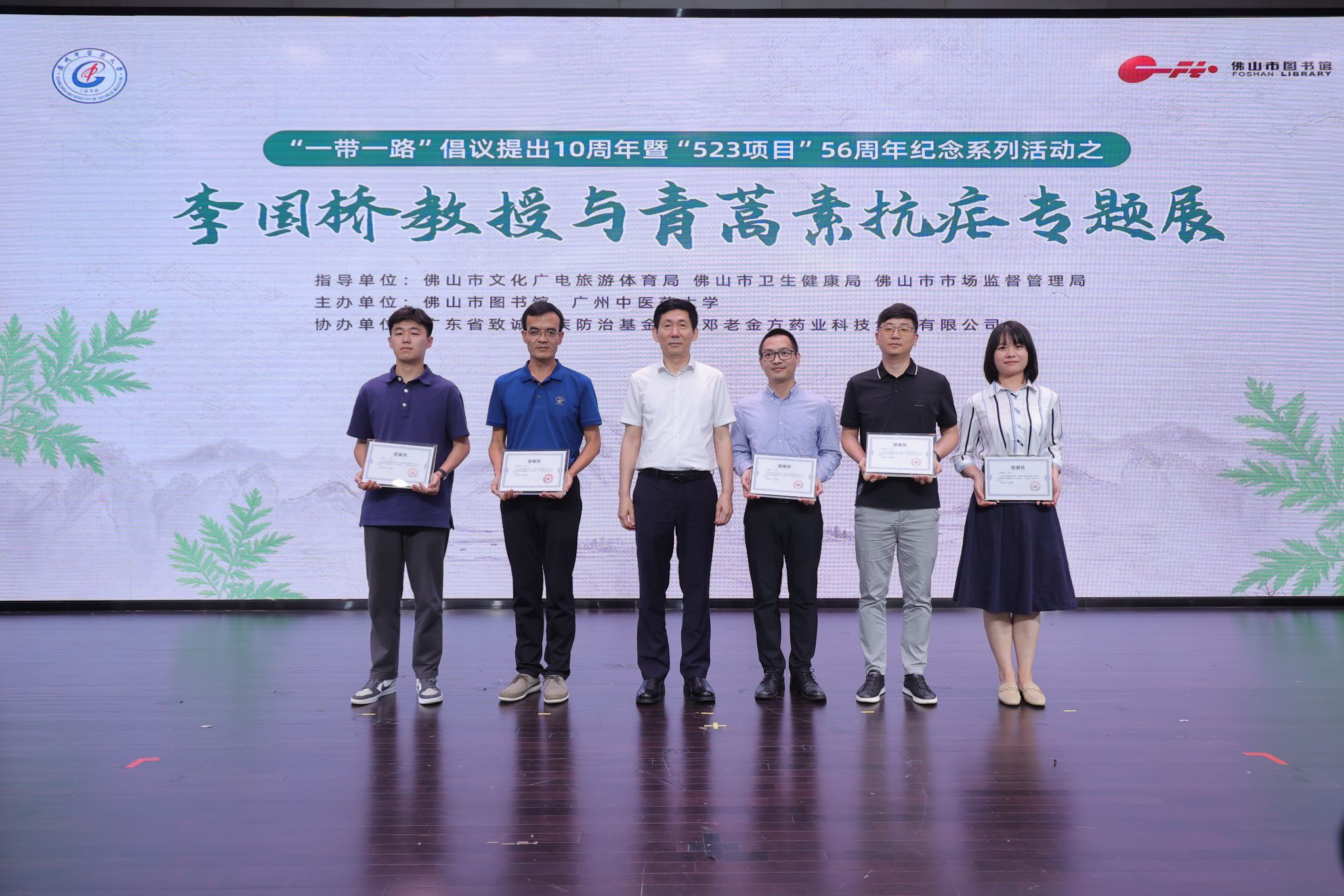 5月23日下午,在佛山图书馆我校与该馆共同举办“李国桥教授与青蒿素抗疟专题展”纪念“一带一路”倡议提出10周年暨“523项目”56周年,展示老一代中医药科学家李国桥教授和其团队在青蒿素防治疟疾的临床研究中做出的努力和取得的突出成果,尤其在国际医药卫生交流方面做出的杰出贡献。Beat365中文官方网站校长王伟,佛山市卫生健康局党组书记练凌东以线上、线下方式参加纪念活动并致辞。王伟校长为常驻国外3年以上的5位青年援外人员颁发了感谢状。学校党委副书记邱亚洪主持纪念活动。