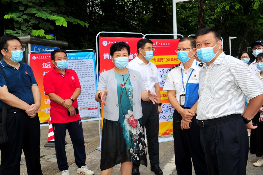 8月27日上午,我校举行了2021年秋季学期学生返校报到流程应急演练,学校党委书记张建华、副校长王宏斌到场指导演练,番禺区教育局处长方美河、广州大学城管委会一级调研员蔡承远一行到校观摩演练并进行开学返校专项工作督查。