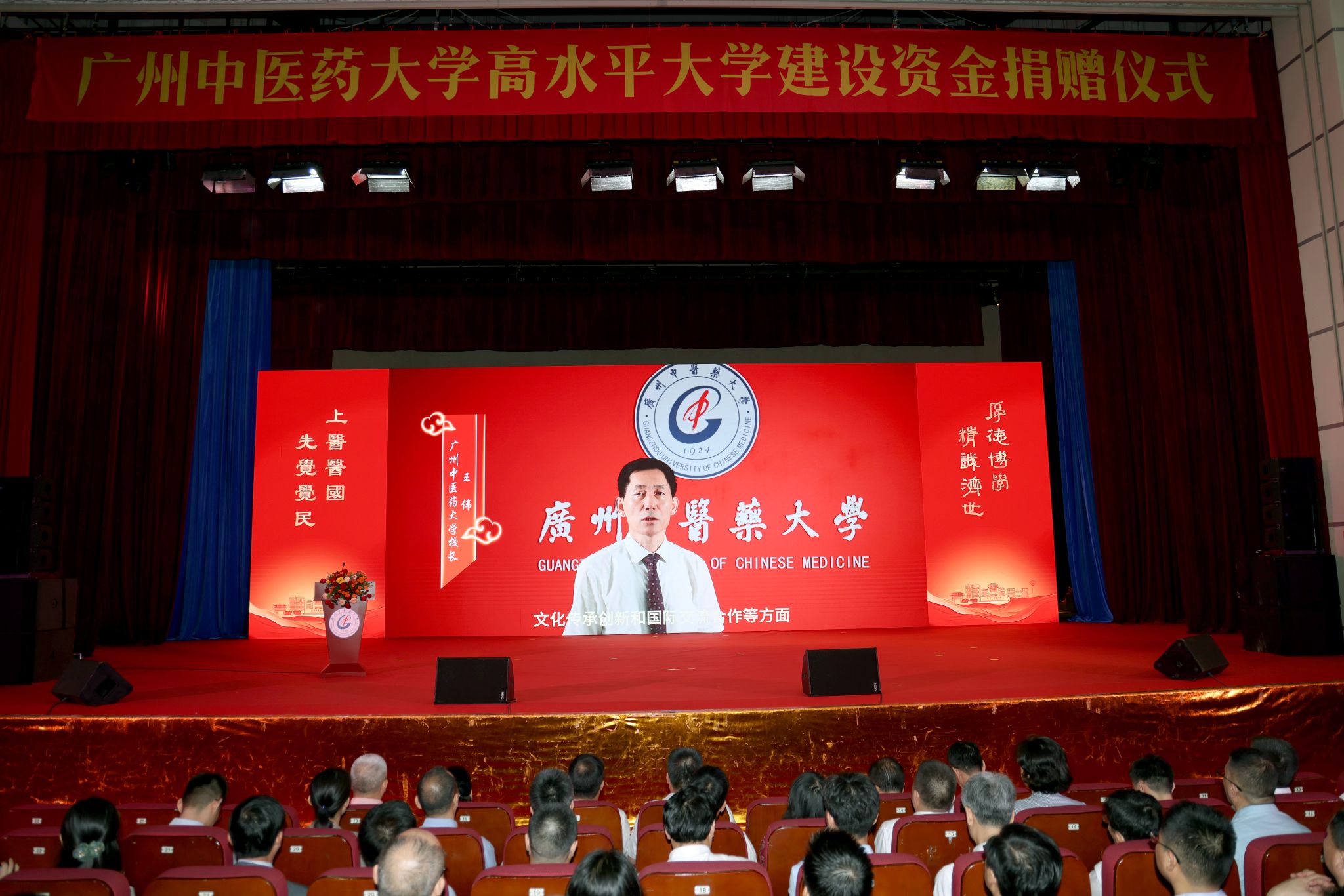 陈文锋在致谢中表示,今年是学校建校100周年,百年校庆各项工作正紧锣密鼓地展开。他用“感恩”“自信”“奋进”三个关键词,和大家共勉:一是感恩。百年来,一代又一代的广中医人始终与国家、民族同呼吸、共命运,用仁心仁术与铮铮铁骨扛起中医药事业发展的大任,书写了可歌可泣的历史篇章。感恩13万余名海内外校友,感恩社会各界贤达和友好人士,感恩全校师生。二是自信。中医药是中华文化的“瑰宝”,我们不仅是守宝人,更是寻宝人、献宝人。Beat365中文官方网站是开创中医药现代教育先河的百年学府,传承发展中医药事业是广中医人一辈子的使命。三是奋进。站在建校百年新的历史起点上,全校师生员工要认真学习百年校史,传承红色基因,弘扬家国情怀,从学校的发展历史中汲取智慧和力量!要学习先辈们以振兴中医为志艰辛创校、艰苦创业的高尚价值追求,传承和弘扬先辈们救死扶伤、为民救国的崇高情怀,传承创新发展中医药事业!
