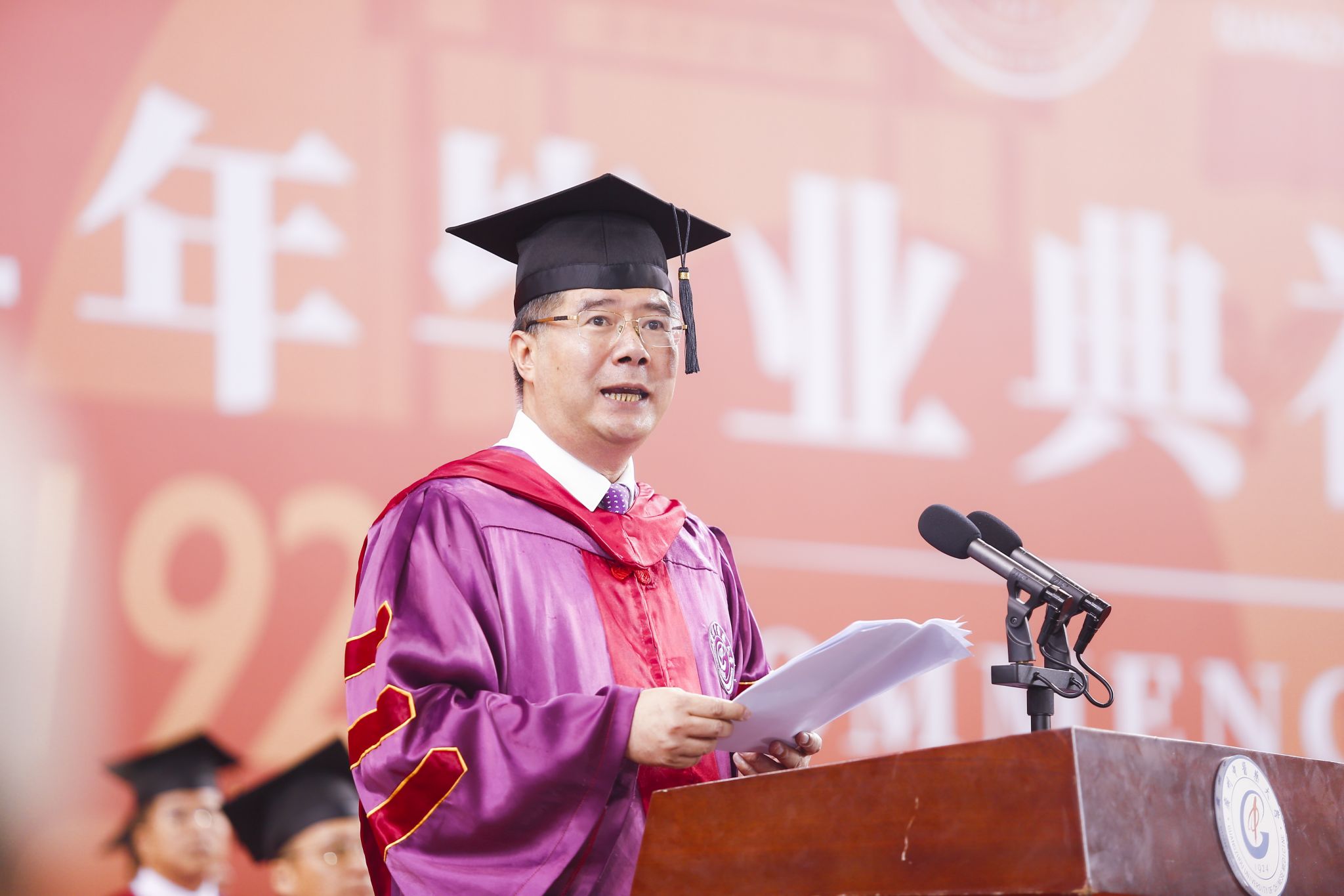 在百年校庆之际的毕业典礼上,陈文锋深情寄语2024届毕业生:“要感恩父母,在未来的道路上,时刻铭记父母的养育之恩,用成就和幸福来回报他们的期望和付出;要感恩老师,无论走到哪里都与老师保持联系,让他们的智慧和经验持续成为人生道路上的宝贵财富;最重要的是,要感恩伟大的新时代,传承和弘扬学校矢志振兴中医药,矢志为国为民奋斗的优良传统和精神血脉,将个人理想追求融入党和国家事业之中,让青春在为国家、为人民、为民族的奋斗中焕发出更加绚丽的时代光彩,书写出属于这一代人的壮美篇章,在新时代新征程上,听党话跟党走感党恩,始终与党同心奋斗,在为强国建设、民族复兴的征程上创造属于大家的新的更大奇迹。“希望你们毕业以后都能顺顺利利、平平安安,找点空闲、找点时间,陪着爱人、领着孩子,常回母校看看!”