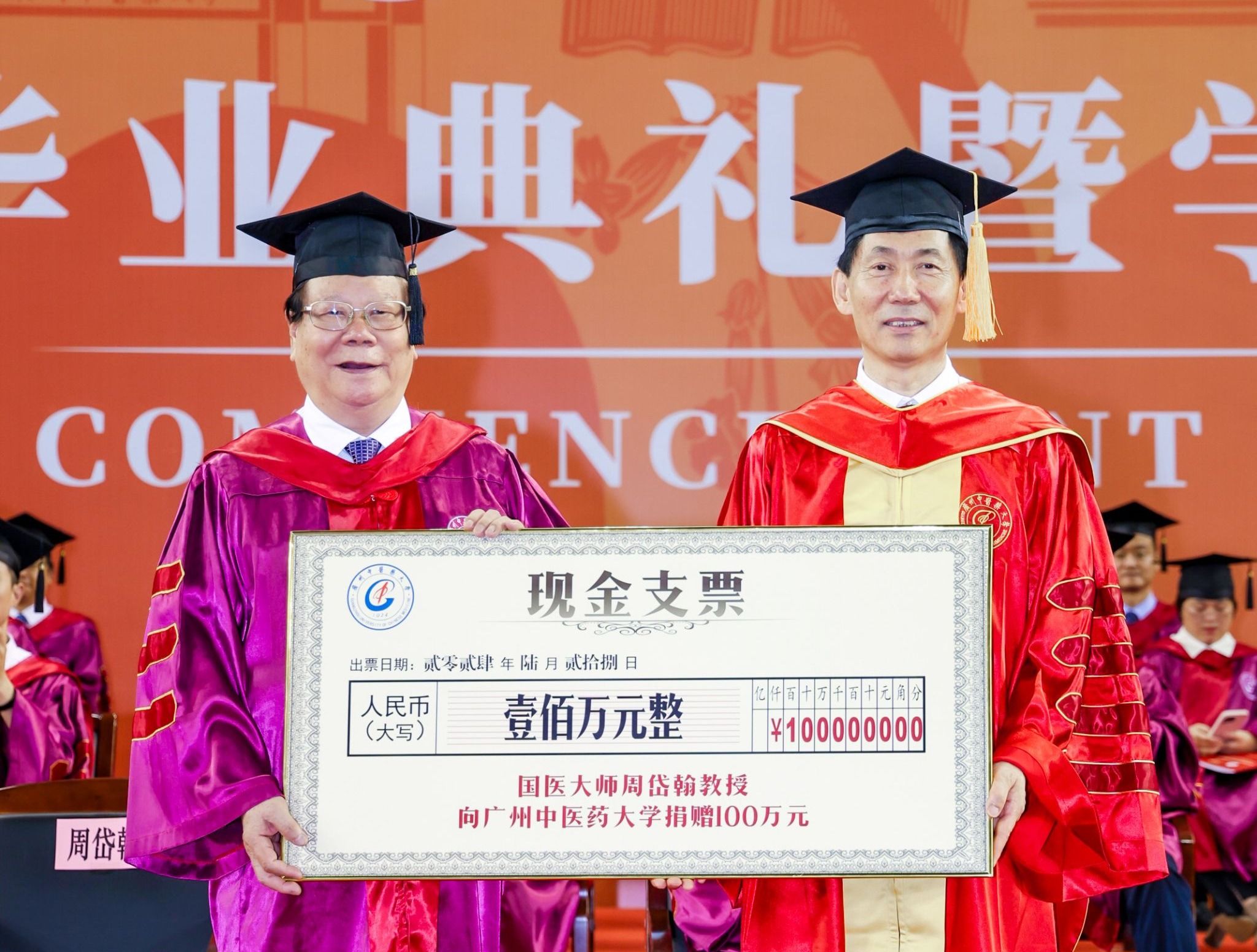 毕业典礼上,周岱翰教授为母校捐赠100万元设立奖教学金,助力高水平大学建设。