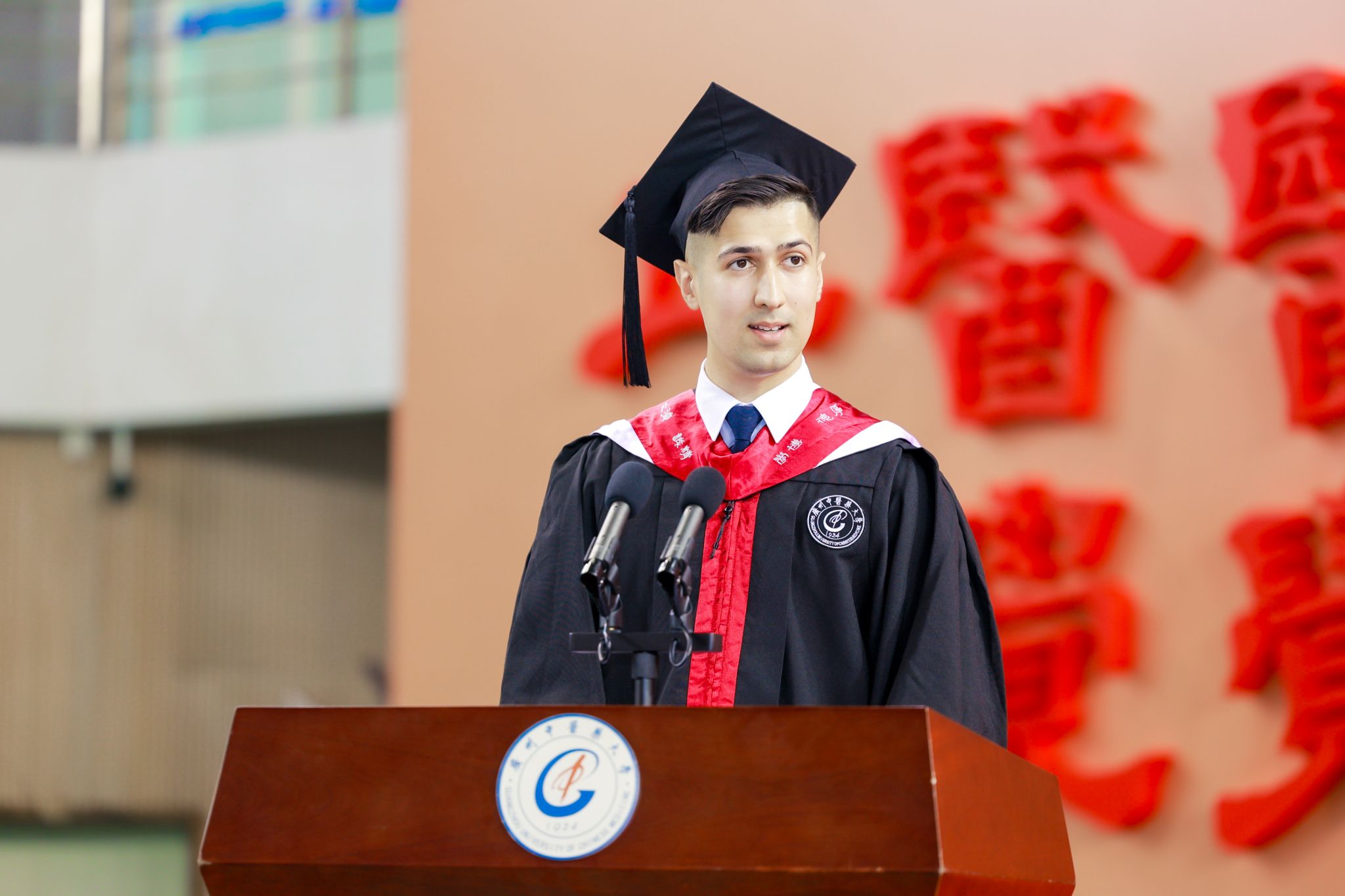 优秀毕业生代表、中医学专业本科生、来自巴基斯坦的简雅山,对学校和学院创造良好的学习平台、老师的付出与教导、同学的一路相伴表示衷心感谢,并表示将带上“厚德博学 精诚济世”回到祖国,用所学专长和医者仁心守护巴基斯坦人民的健康,让他们享受中医药带来的健康助益,为中医药文化的传播发展奉献力量。