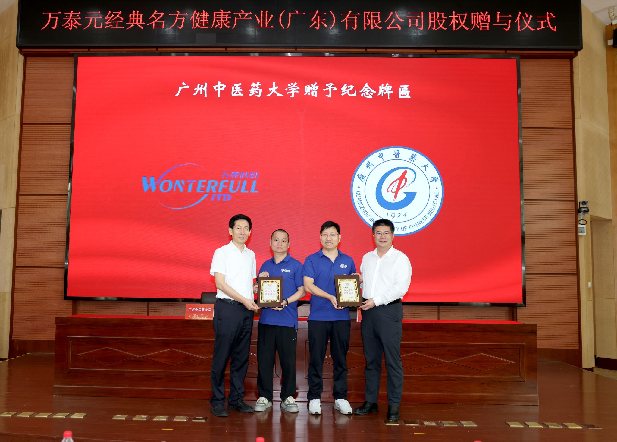 学校党委书记陈文锋,党委副书记、校长王伟出席仪式见证签约并分别向傅苗青先生,周白水先生颁发捐赠纪念牌。党委副书记邱亚洪主持会议,副校长王宏斌出席活动。学校党委办公室、校长办公室、科技部、资设部、财务部、校友会、资营公司负责同志及万泰元经典名方健康产业(广东)有限公司有关负责同志参加仪式。