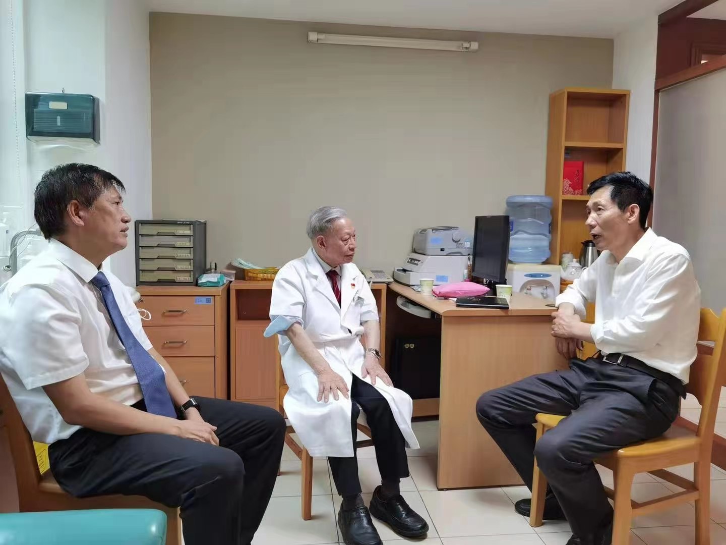 慰问中,王伟校长与大家亲切握手,促膝交谈,仔细询问大家的生活情况和健康状况,认真听取他们对学校学科、教学、医院建设等方面发展的意见和建议,代表学校党委感谢大家多年来对学校的关心和支持。“莫道桑榆晚,为霞尚满天”,希望各位专家和老干部充分发挥自身优势,始终保持老骥伏枥、老当益壮的心态,为推动学校的各项事业发展发光发热,凝聚力量,共同见证学校更加美好的明天。