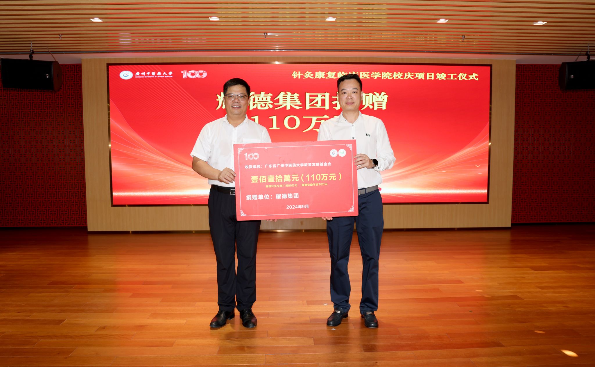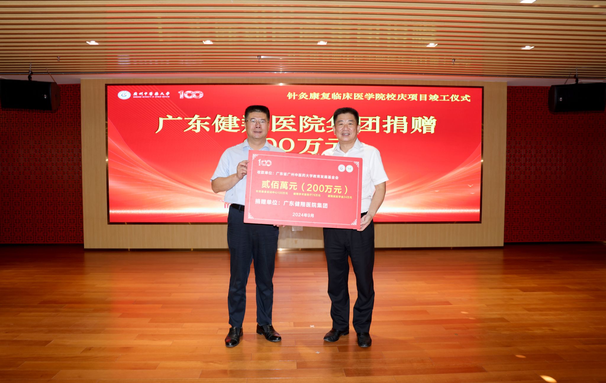 在学校即将迎来建校百年、针灸康复临床医学院迎来建院四十周年之际,广东省健翔医院集团捐赠建设针灸推拿实训中心、健翔学术报告厅,设置健翔奖助学金共计200万元;耀德集团捐赠建设耀德针灸文化广场,设置耀德奖助学金共计110万元。