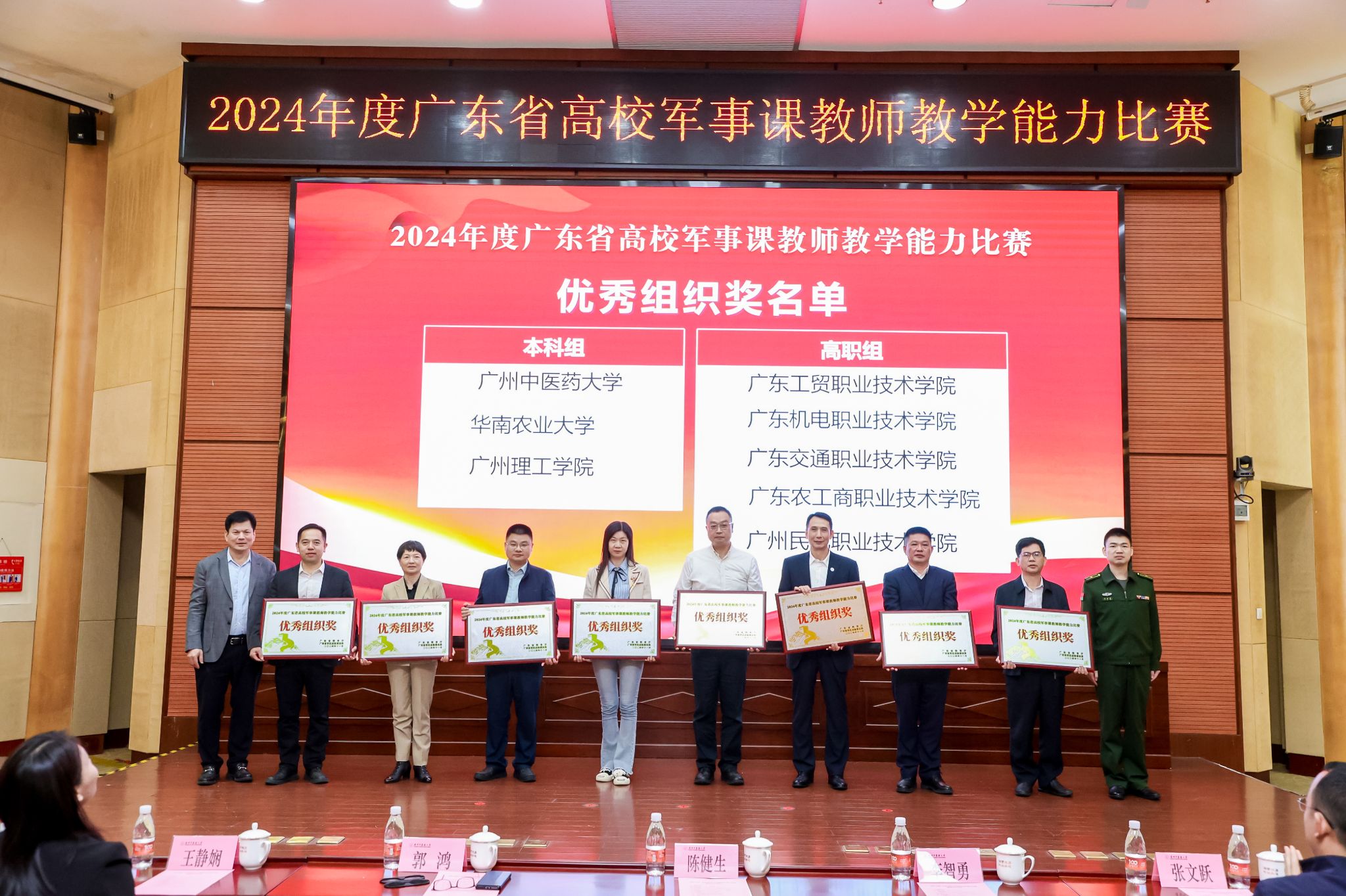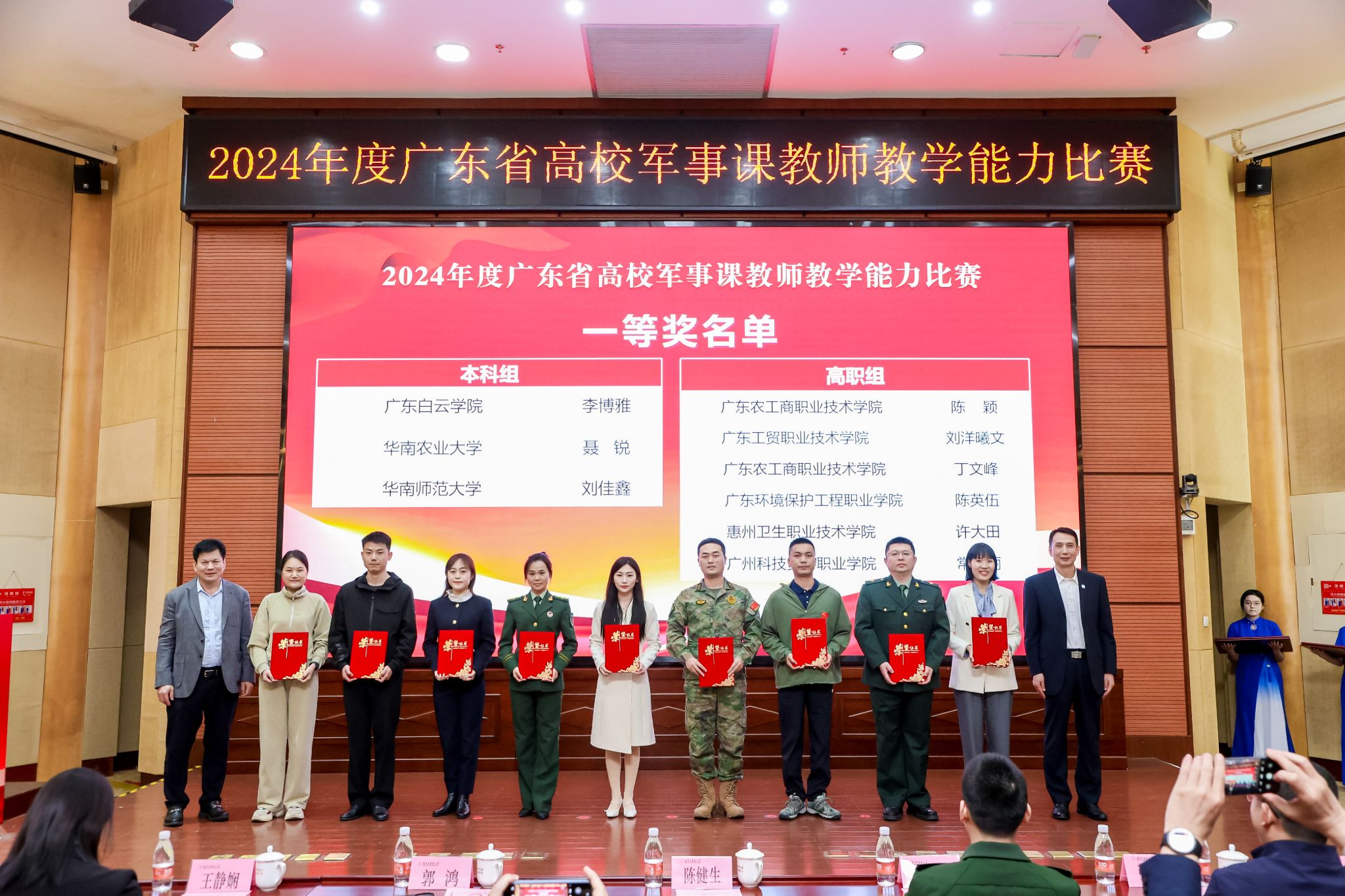 12月1日晚,2024年度广东省高校军事课教师教学能力比赛(决赛)颁奖仪式在我校大学城校区举行。广东省教育厅二级巡视员陈健生,广东省教育厅体育卫生与艺术教育处处长王静娴、副处长张文跃,广东省军区战备建设局少校营级正职参谋李智勇,Beat365中文官方网站党委常委、副校长郭鸿,各评委组组长、参赛选手和学生代表出席颁奖仪式。学校保卫部(武装部)部长温祥彬主持仪式。