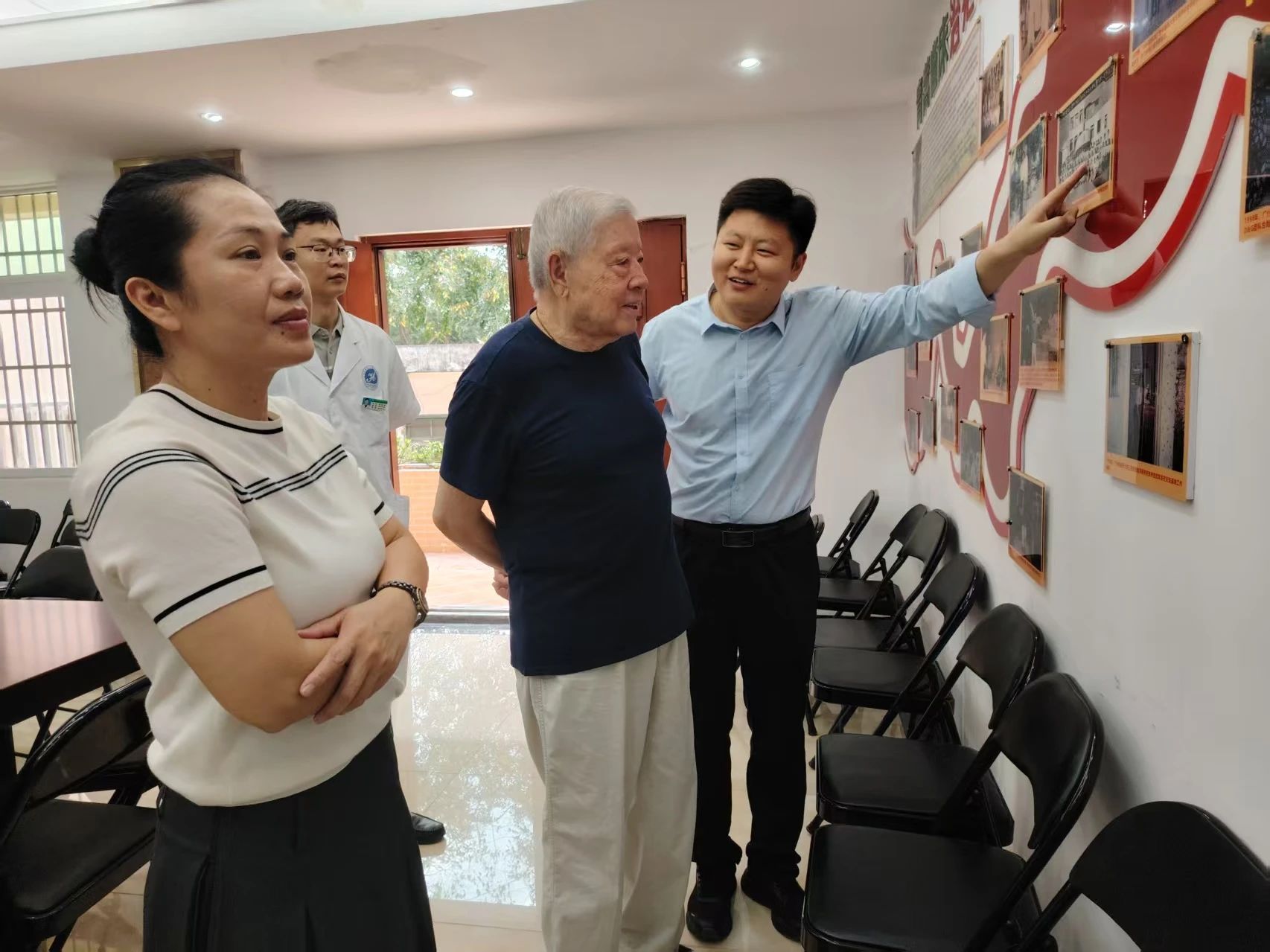 在抗疟疾照片展示区,国医大师沈宝藩教授深情回忆和首届国医大师邓铁涛教授、学校原副校长李国桥教授交往的点点滴滴,鼓励年轻一辈的广中医人铭记历史,传承发扬好中医药传统文化。他详细了解医院抗疟历史,充分肯定医院在公共卫生领域作出的重要贡献,希望医院要进一步保护好、传承好、发扬好国家级青蒿抗疟临床研究的精神文化,传承和发展中医药在传染病防治领域的独特优势,助力构建人类卫生健康共同体。