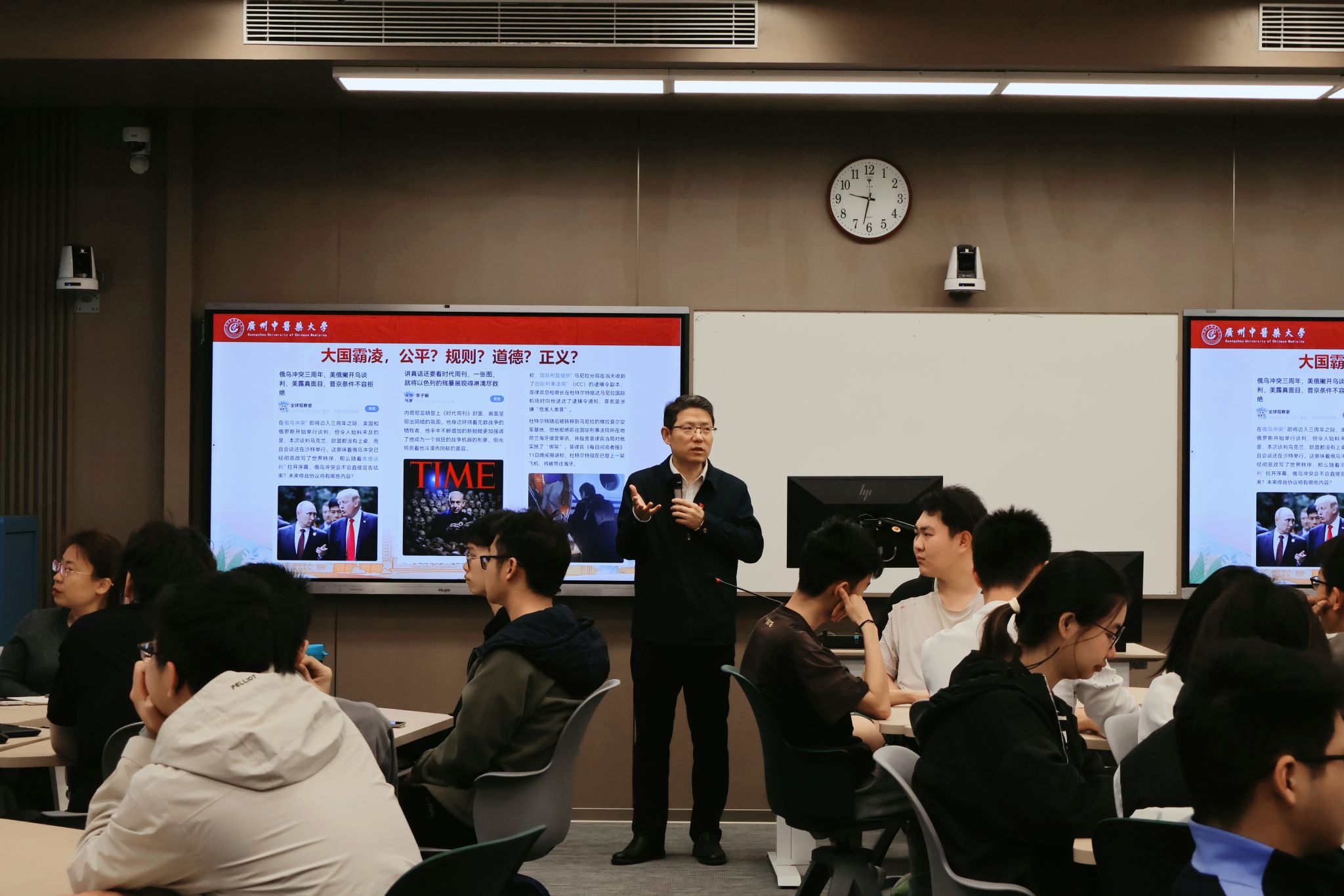 史亚飞以近期国际形势为切入点,通过分析背后的冲突根源、现状及未来趋势与同学们共同解读时事热点,透视政治格局。通过比对国内国际的政治环境,启发同学们思考西方民主的本质,让同学们深刻认识到百年未有之大变局下,我国发展道路的正确性和独特优势,激励大家坚定理想信念,担当起民族复兴的重任。