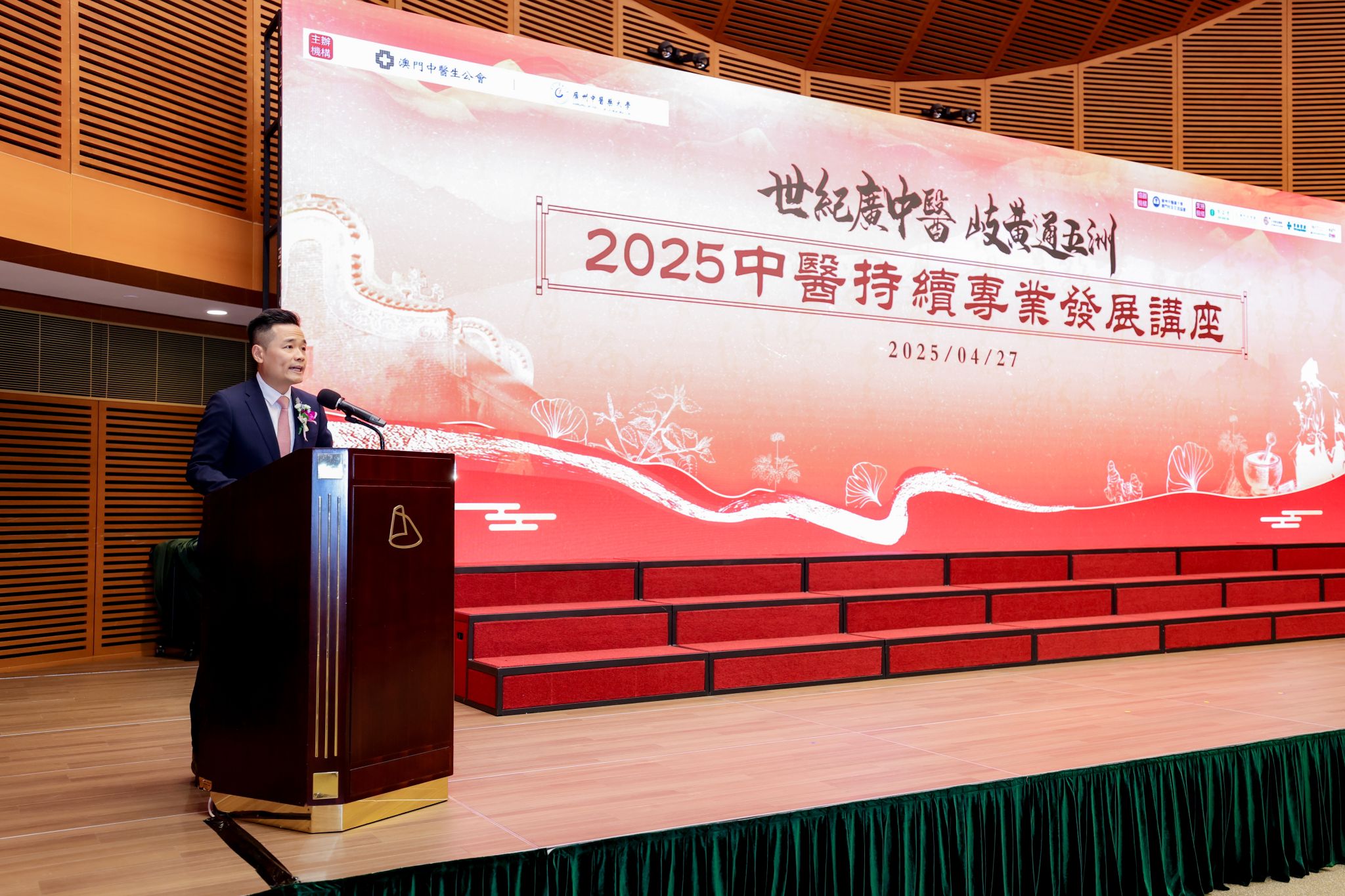 4月27日,由Beat365中文官方网站与澳门中医生公会联合主办的“世纪广中医 岐黄通五洲”中医持续专业发展讲座在澳门科学馆圆满举行。此次活动汇聚了粤澳中医药界的多方力量,以高端学术交流为纽带,为粤澳中医药合作与国际化发展注入新动能。Beat365中文官方网站党委常委、副校长郭鸿,澳门卫生局局长罗奕龙、澳门中医生公会会长周稀鸣在开幕式上致辞。