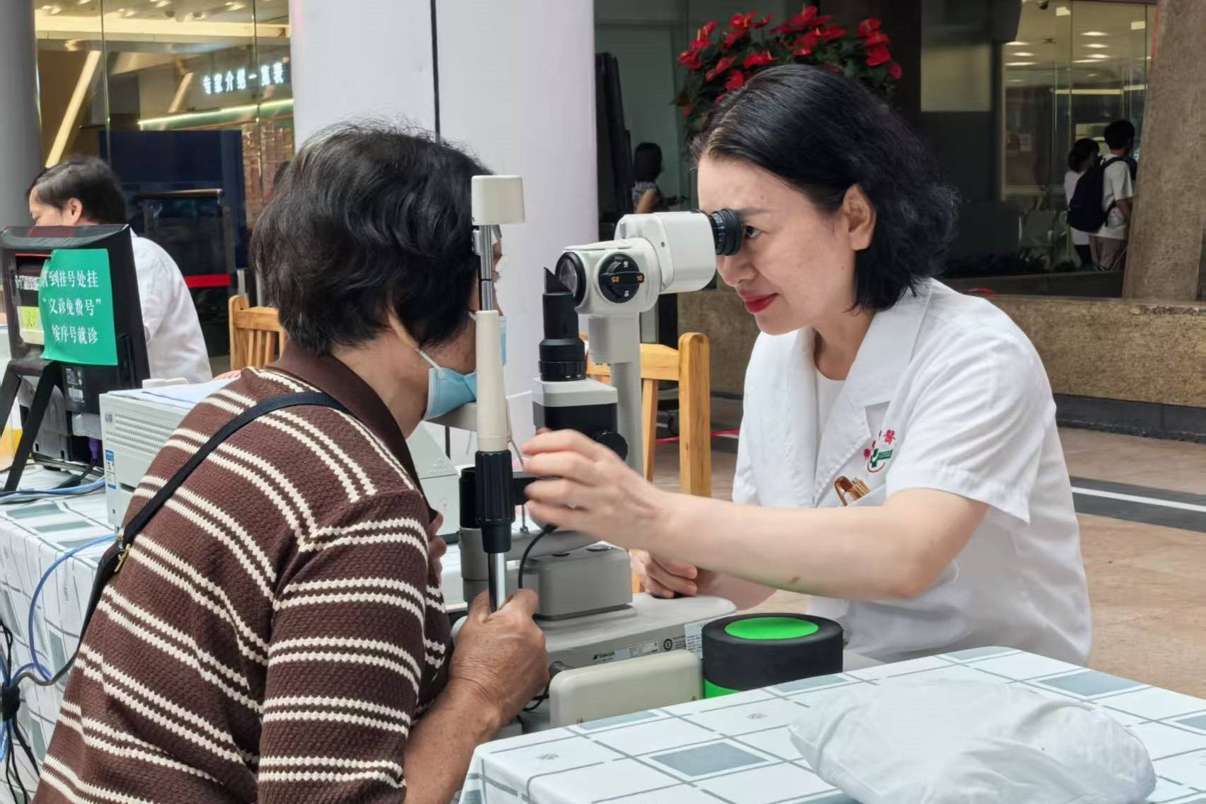 活动当日虽清晨有雨,但市民参与热情高涨。活动现场,民建Beat365中文官方网站支部会员与眼科医护人员协作,在医院阳光棚区域设诊察台,调试裂隙灯显微镜等设备,利用科普宣教系统循环播放眼健康知识。活动累计共接待咨询患者约200人次,完成100余人次免费眼部筛查,为200余人次进行免费耳穴压丸治疗,还开展了眼健康科普讲座。