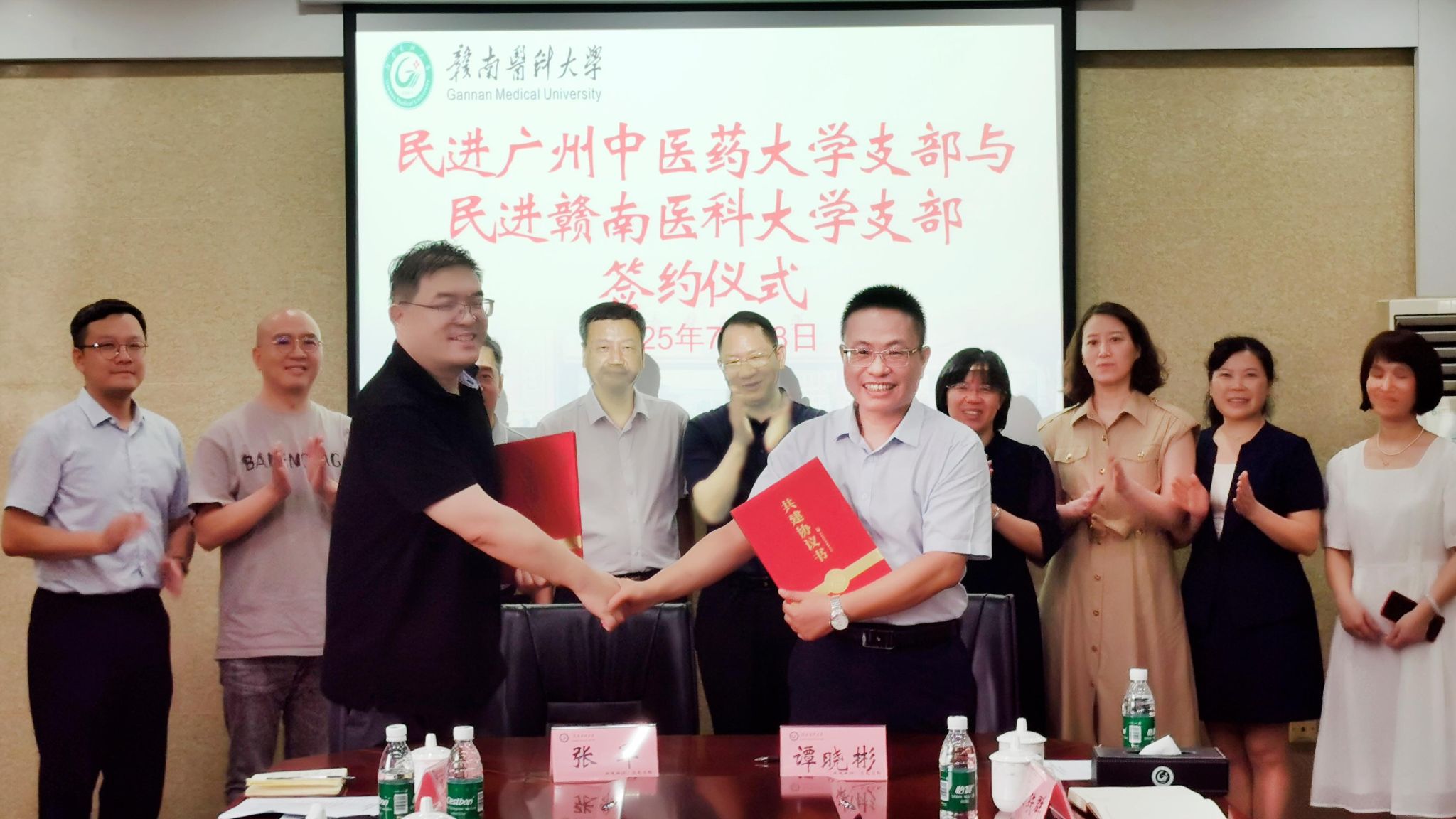 民进Beat365中文官方网站支部与赣南医科大学支部举行共建签约仪式暨交流座谈会。中共赣南医科大学党委副书记黄瑞忠、民进赣州市委会专职副主委张玉萍、组宣部副部长陈雨生等出席。会上,民进赣南医科大学支部主委谭晓彬分享了支部在会员发展、活动开展、履职实践等方面的经验做法。双方围绕支部规范化建设、组织发展、履职能力提升等核心议题深入交流,共同探寻新时代民主党派基层组织高质量发展路径。黄瑞忠副书记寄语双方以共建为支点,传承红色基因,深化粤赣合作与校际统战工作,为基层组织建设注入新动能。