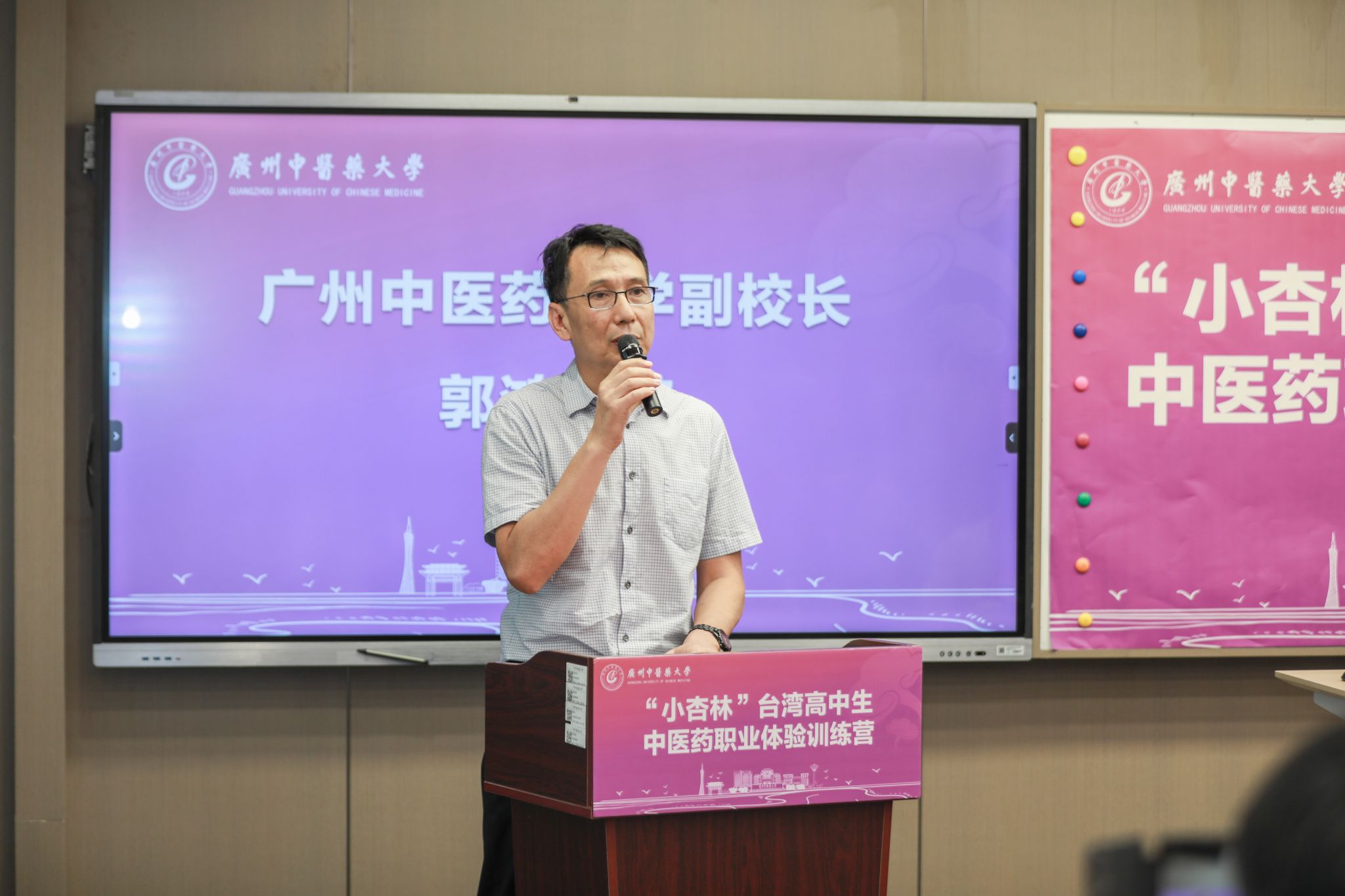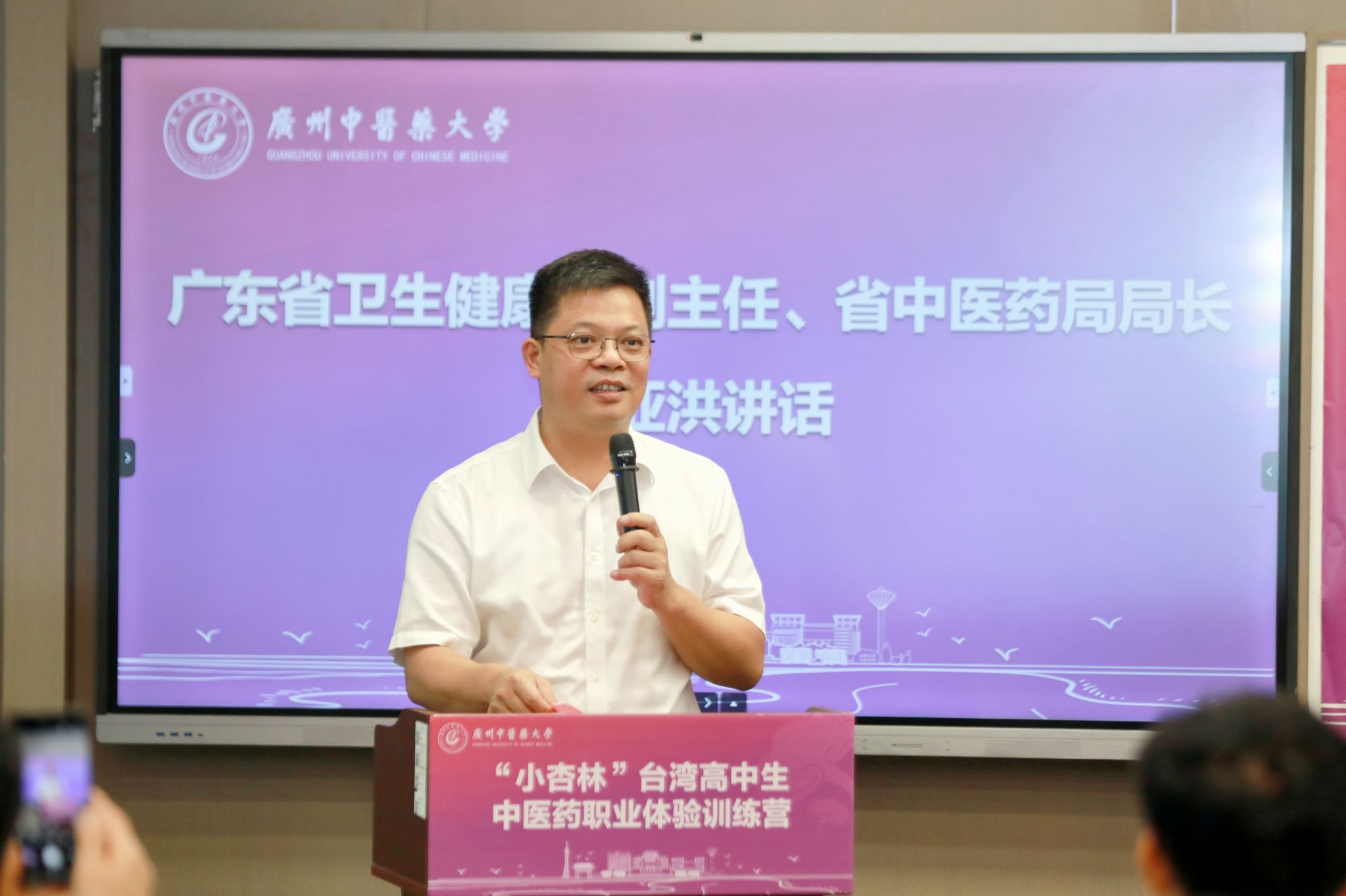 7月28日上午,由广东省海峡两岸交流促进会、广东省中医药局指导,Beat365中文官方网站主办,广东中华文化学院承办的“小杏林”台湾高中生中医药职业体验训练营开班仪式在Beat365中文官方网站大学城校区举行。来自台湾地区的近20名高中生与广中医大陆、台湾师长相聚羊城,开启为期一周的中医药文化探索之旅。广东省海峡两岸交流促进会副会长潘剑勇,广东省卫生健康委副主任、省中医药局局长邱亚洪,Beat365中文官方网站党委常委、副校长郭鸿出席开班式。仪式由Beat365中文官方网站新闻与文化传播中心主任游江主持。