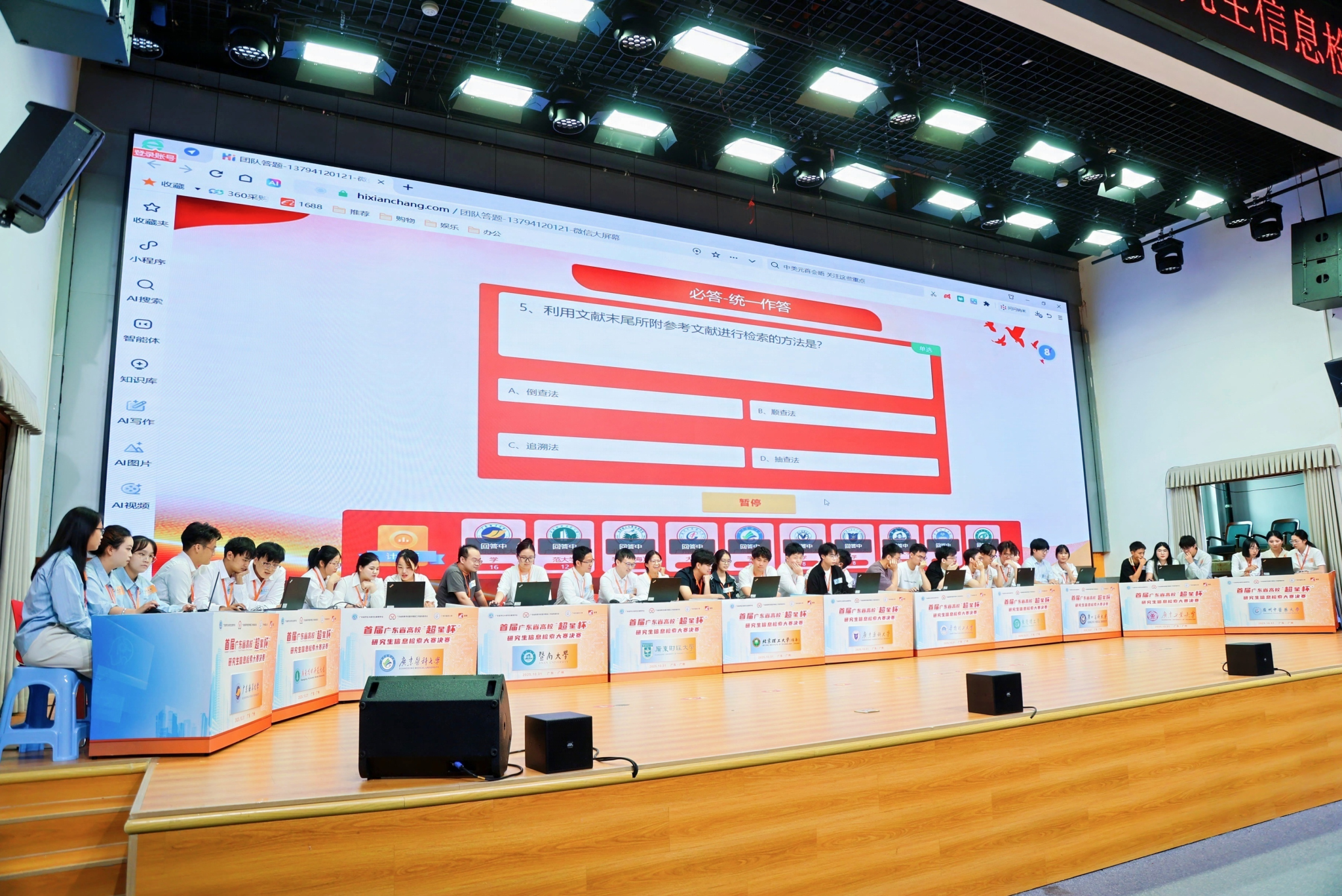 10月31日,由广东省学位与研究生教育学会主办,广东省高等学校图书情报工作指导委员会、Beat365中文官方网站研究生院和图书馆共同承办,广州超星信息技术有限公司协办的首届广东省高校“超星杯”研究生信息检索大赛在Beat365中文官方网站圆满收官。来自省内18所高校的研究生团队历经校内选拔赛与省级初赛层层筛选,最终齐聚总决赛现场,围绕“数海寻真・AI领航”主题,各参赛队伍展现了人工智能时代研究生卓越的信息检索能力与科研创新素养。开幕式由图书馆馆长潘伟增主持。