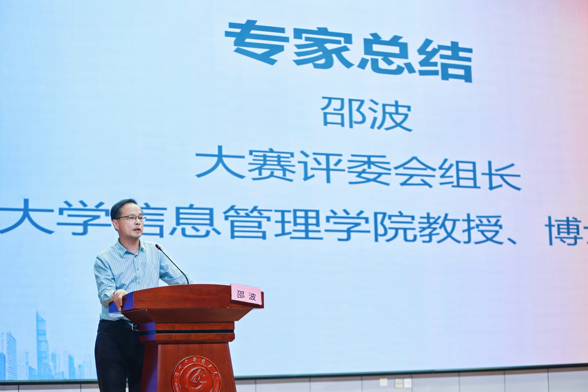 评委代表、南京大学信息管理学院邵波作总结点评。他充分肯定本次大赛的组织水平与参赛队伍的表现,认为各队伍在创新汇报环节展现出的实践思路具有较高的学术价值,客观题环节的表现也反映出全省研究生信息素养的整体提升。同时,他也为后续信息素养教育提出建议,希望各高校进一步加强相关课程建设,培养更多具备高水平信息检索能力的研究生。