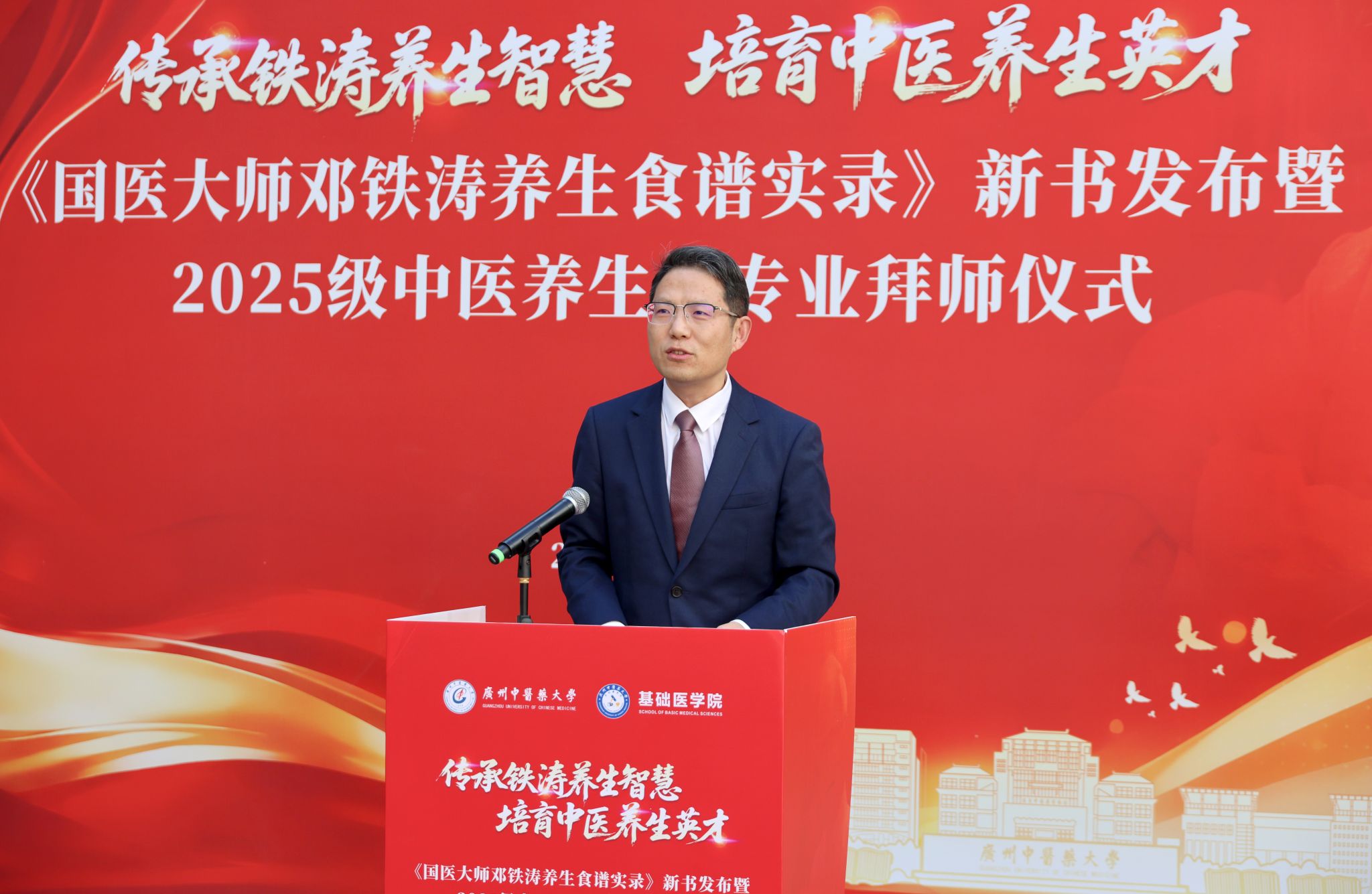 学校党委常委、副校长史亚飞教授在致辞中指出,邓铁涛教授作为中医药事业的泰斗级人物,其“养生重于治病”的核心理念,不仅是个人毕生实践的智慧结晶,更是中医药“治未病”思想的生动诠释,深刻契合了新时代人民群众对健康福祉的迫切需求与健康中国战略的核心要义。他强调,《国医大师邓铁涛养生食谱实录》的发布绝非简单的学术成果展示,而是将顶尖中医智慧转化为大众可及、可学、可用的健康指南,是中医药文化“飞入寻常百姓家”的创新实践;而2025级中医养生专业拜师仪式的举行,则是对中医“师带徒”这一人才培养模式的传承与活化,为中医药养生学科建设与高层次人才培育筑牢根基,彰显了高校在传承发展中医药事业中的责任与担当。