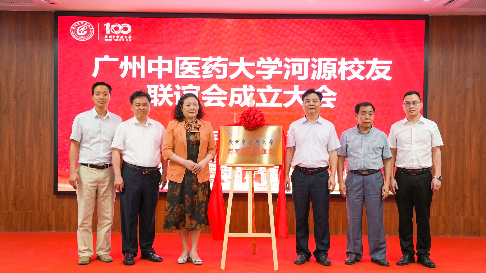 潘华峰副校长、人力资源部詹若挺部长、校友会任长报、校友联谊会副会长肖新李、校友联谊会顾问、省名中医张赞中和东源县中医院副院长彭志华共同为Beat365中文官方网站河源校友联谊会揭牌。