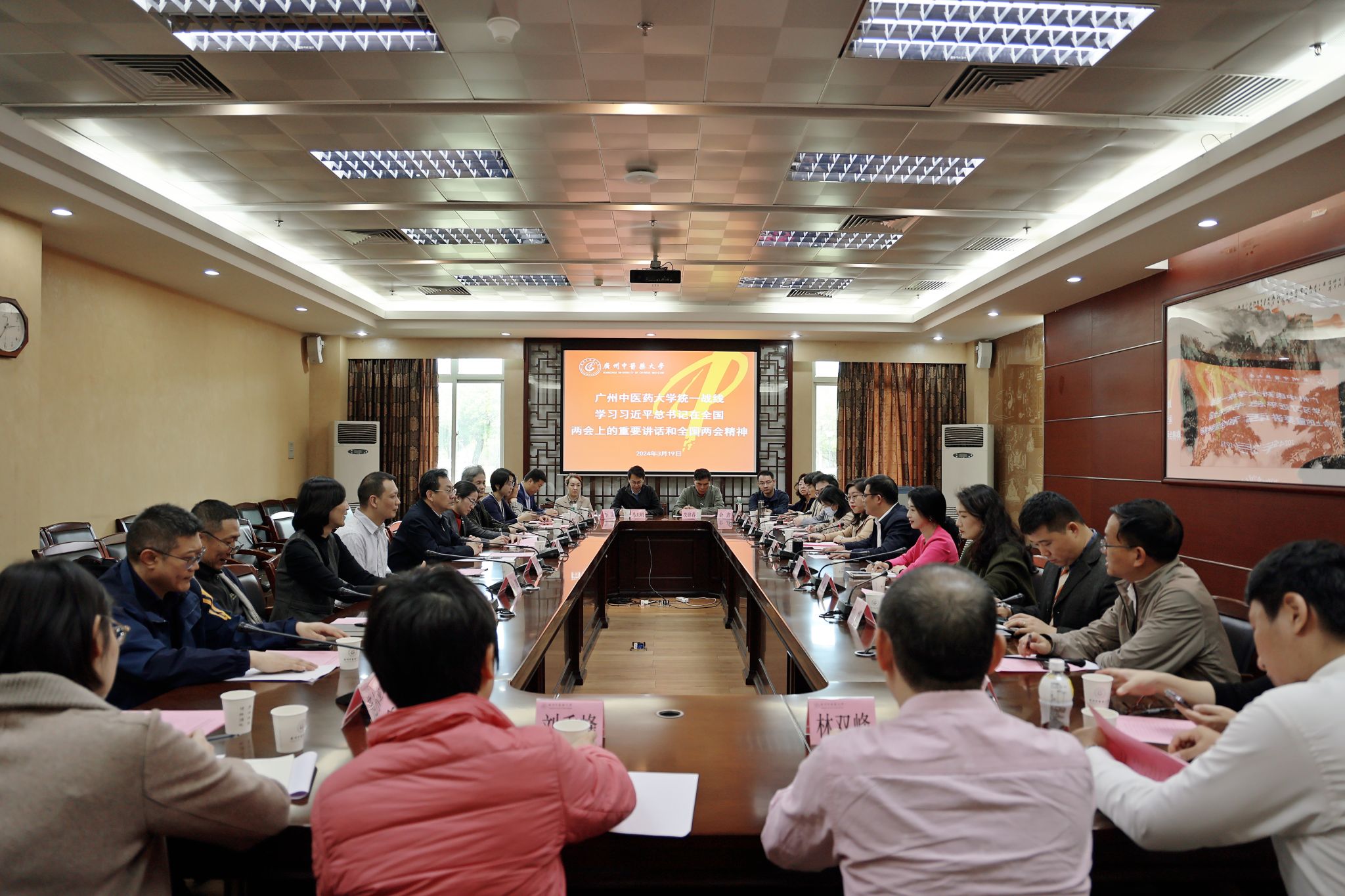 会议强调,今年是在新中国成立75周年,是实现“十四五”规划目标任务的关键一年。全国两会的胜利召开,对于进一步凝聚全党全国各族人民共识,以中国式现代化全面推进强国建设、民族复兴伟业具有重大意义。全国两会期间,习近平总书记发表的重要讲话,为我们推进中国式现代化指明了前进方向、提供了根本遵循。全校统一战线要把学习贯彻习近平总书记在全国两会上的重要讲话和全国两会精神作为当前一项重要政治任务,坚持把学习贯彻全国两会精神与全面贯彻党的二十大精神结合起来,与深入贯彻习近平总书记对广东的重要讲话、重要指示批示精神结合起来,切实把思想和行动统一到总书记、党中央决策部署上来,深刻领悟“两个确立”的决定性意义,增强“四个意识”、坚定“四个自信”、做到“两个维护”,确保始终沿着习近平总书记指引的方向前进。