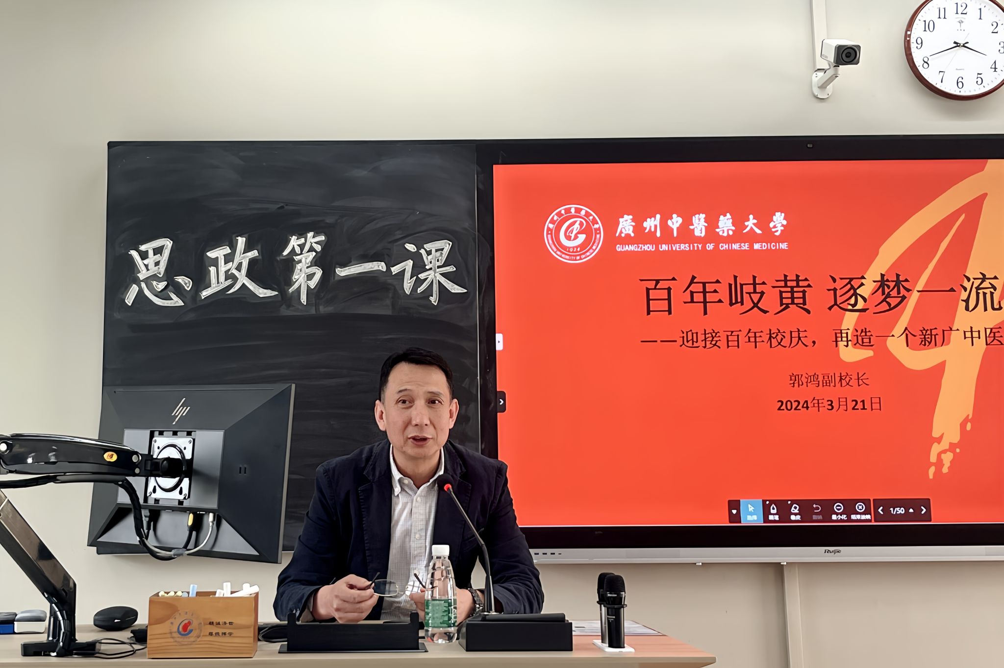 3月21日下午,学校党委常委、副校长郭鸿在教学楼B407以“百年岐黄,逐梦一流”为题,为2022级医学信息工程1班全体同学讲授“思政第一课”。