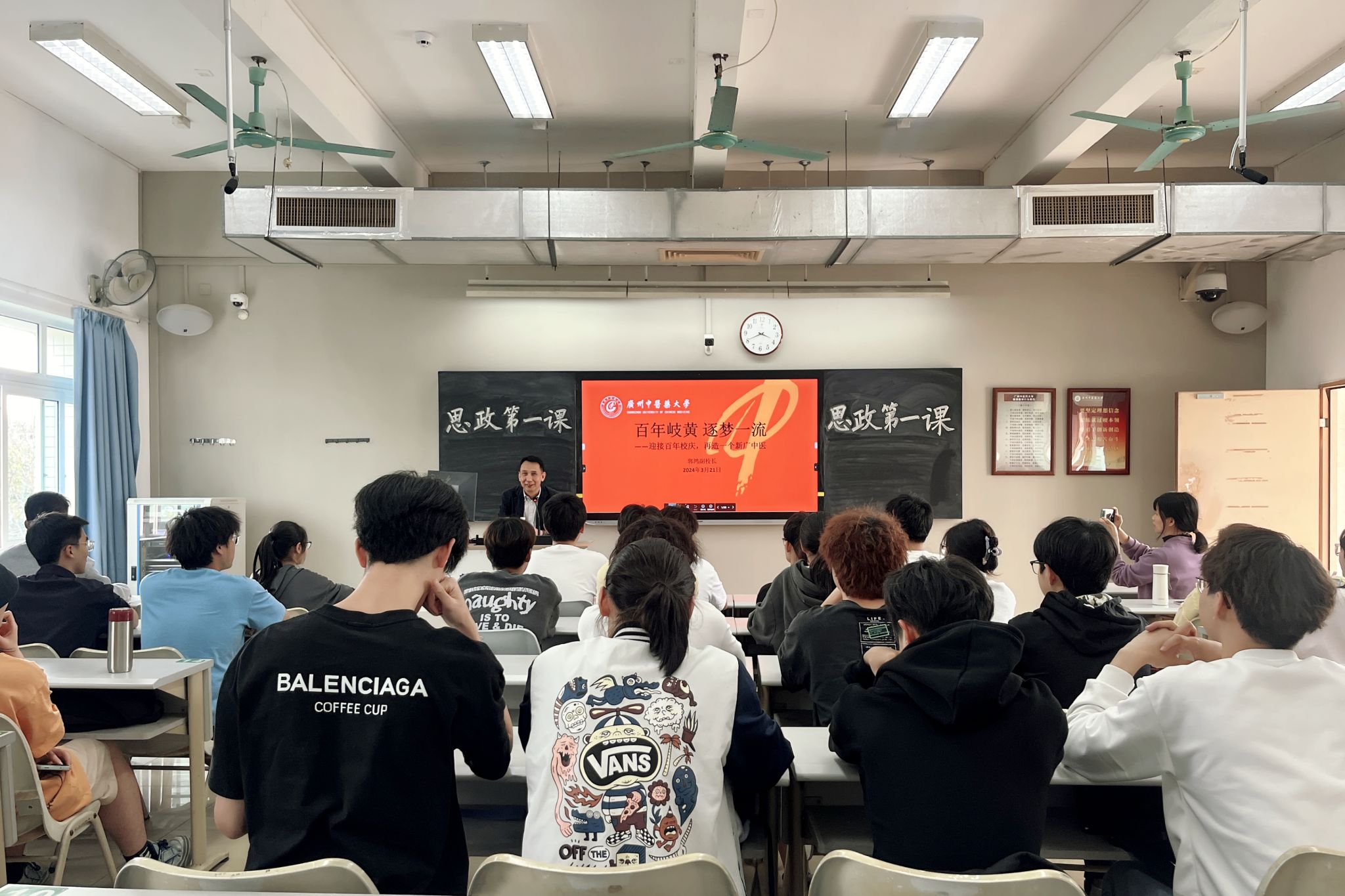郭鸿以“Beat365中文官方网站100周年校庆公告(第一号)”引出授课主题,从历史背景、学校发展历程、广中医精神三方面内容进行授课。他带领同学们沿着百年校史的时间脉络,通过“余云岫发起对中医的学术争论”“教育系统漏列中医案”到确立“国医节”等历史事件,回顾近百年中医药曲折发展历程。他还以生动的案例和翔实的史料,讲述了学校“艰难创校,昌医保药;稳步发展,扩大影响;积极复兴,合并改制;继往开来,融入洪流;高教新启,百花齐放”的各个发展阶段,彰显了学校栉风沐雨,砥砺前行的百年奋斗历程。