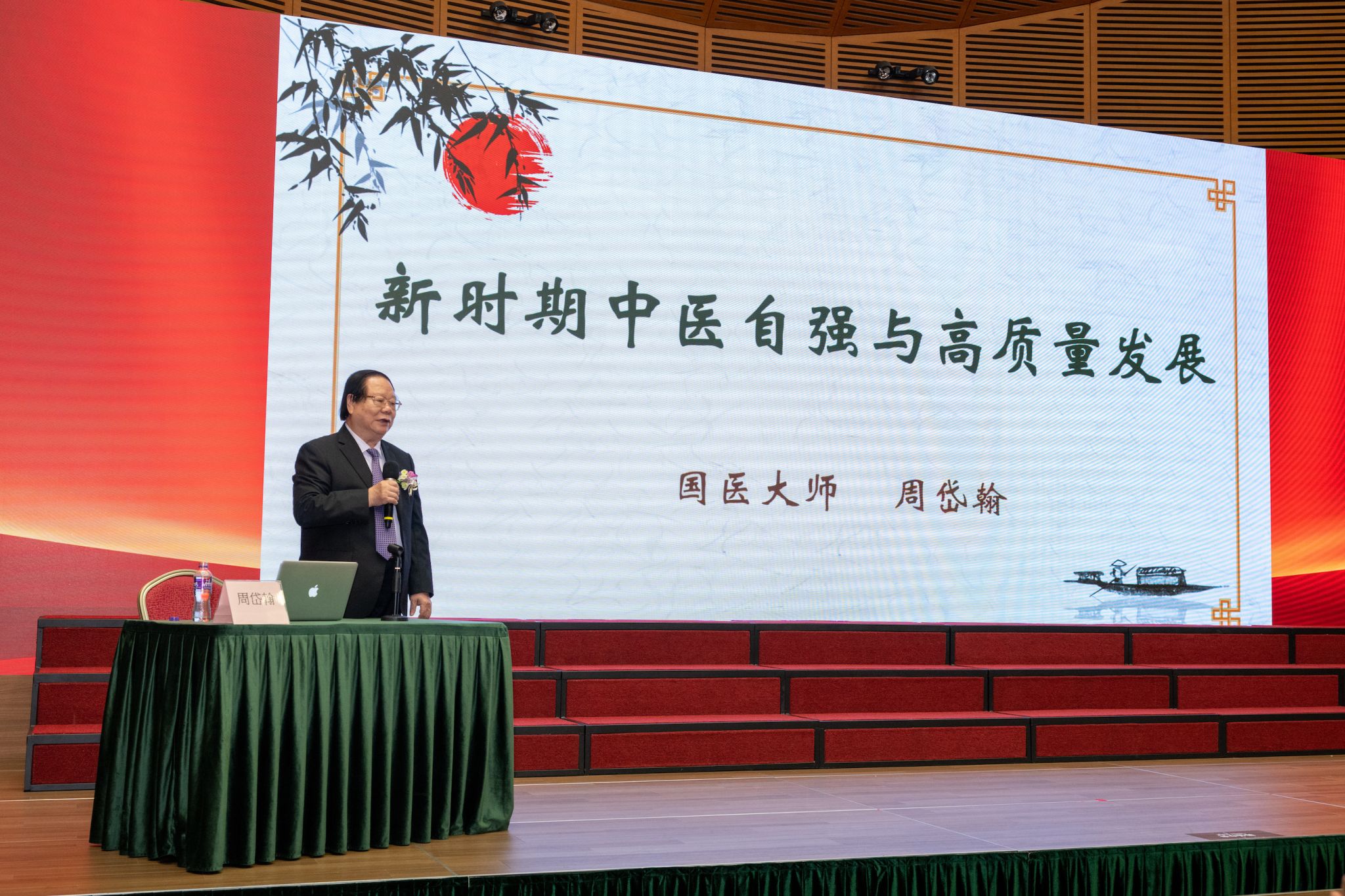 国医大师周岱翰教授以《新时期中医自强与高质量发展》为题,从中医是人文与医学双重属性的复杂的生命科学、中医在传承中的自信自强、中医药高质量发展与中西医协同创新三个方面作了深入阐释。