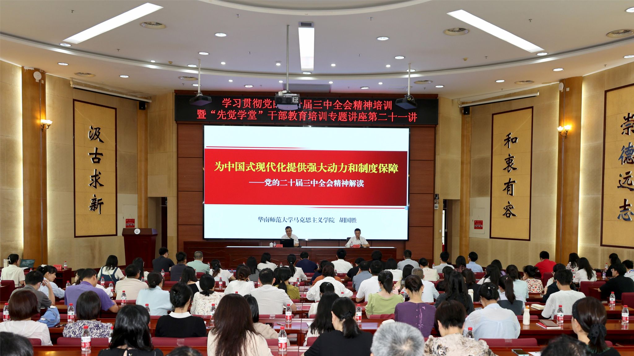 10月18日上午,学习贯彻党的二十届三中全会精神培训暨“先觉学堂”干部教育培训专题讲座第二十一讲在大学城校区举行。本次培训邀请华南师范大学马克思主义学院党委书记、教授、博士生导师、博士后合作导师胡国胜教授为干部作专题辅导。