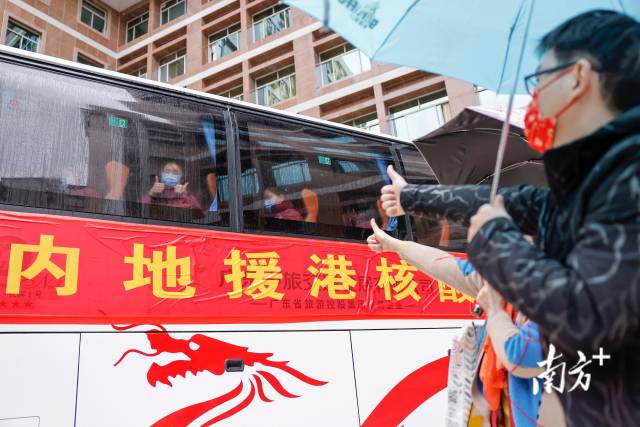 12时30分,小雨迷濛,大巴车缓缓驶离中山一院,工作队队员、护士张清容隔着车窗向人群挥手致意。她的丈夫和2岁半的女儿来到现场送行。丈夫表示,女儿虽然还不太明白妈妈要去做什么,但从小就对医护人员的工作充满崇敬和向往之心。“知道太太主动报名支援香港,我特别理解和支持,希望她早日安全归来,和我们一家团聚。”