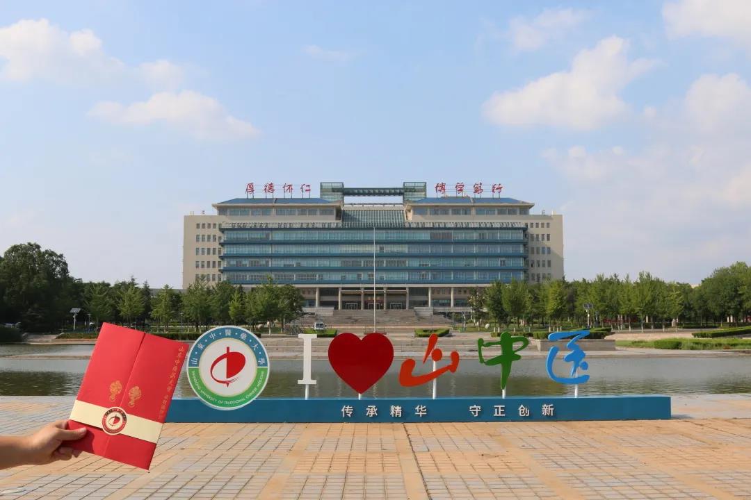 山西中医药大学的录取通知书以红色、淡黄为底色,绘有祥云图案和学校的手绘图。