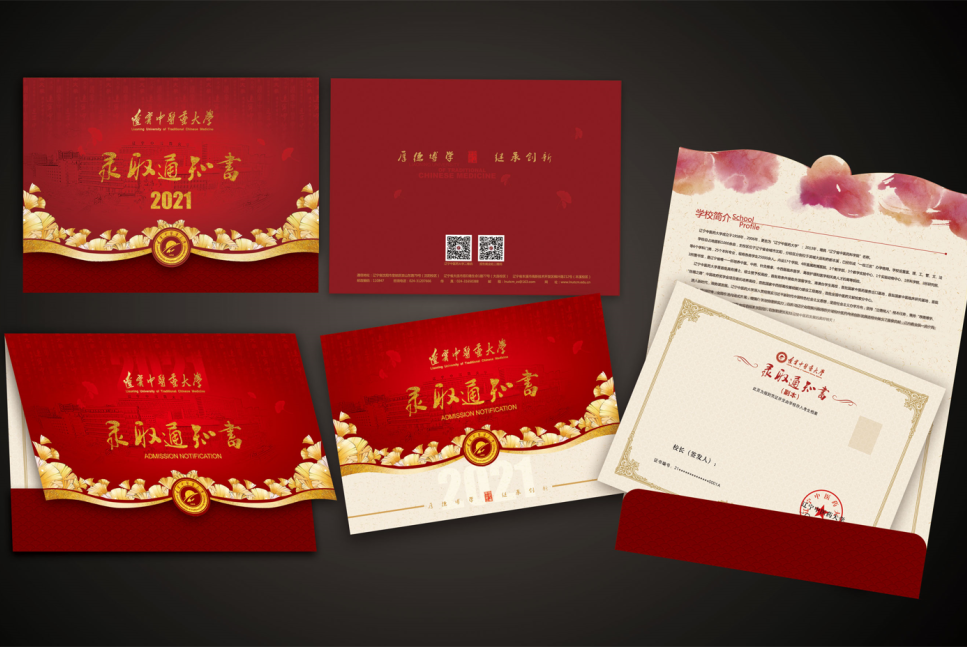 湖北中医药大学2021年本科录取通知书为信笺样式,以红色为主基调,采用烫银工艺手绘。李时珍广场大型浮雕——“九九图”中医文化墙、五行柱正大门、图书馆等学校标志性建筑跃然纸上。古今结合,体现出浓厚的中医药特色。