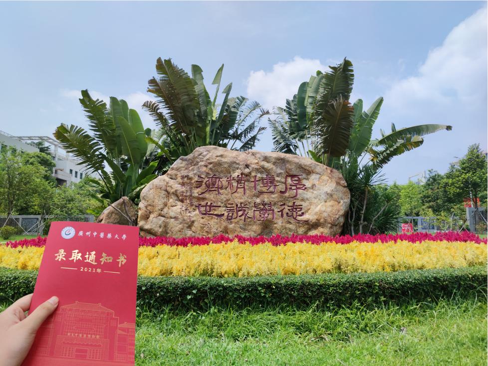 录取通知书以红色为主色调,采用红、白、金三色拼接,底部是广中医地标性建筑,广东中医药博物馆和校训石。