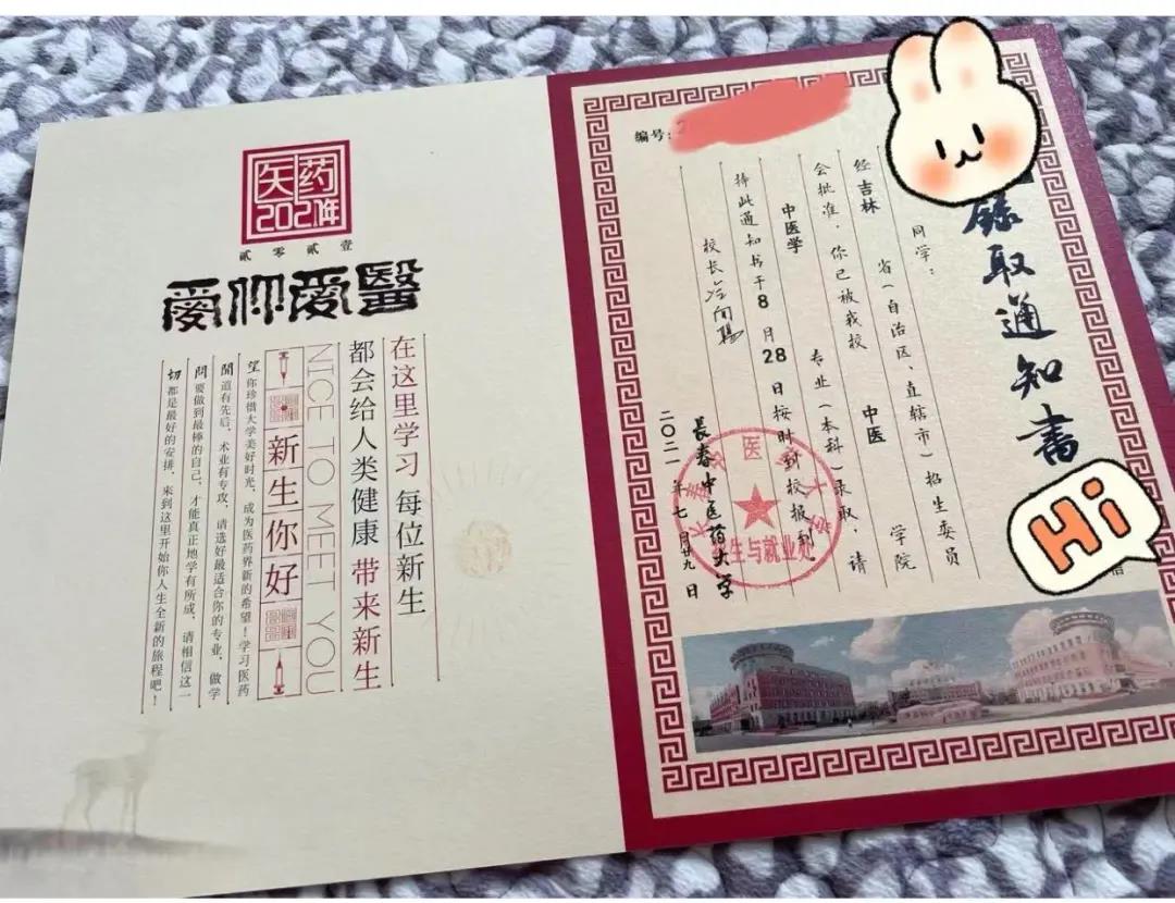 黑龙江中医药大学的录取通知书以红色为底色,封面有手绘的校园风光,并上书“勤奋、求真、博采、创新”的八字校训。