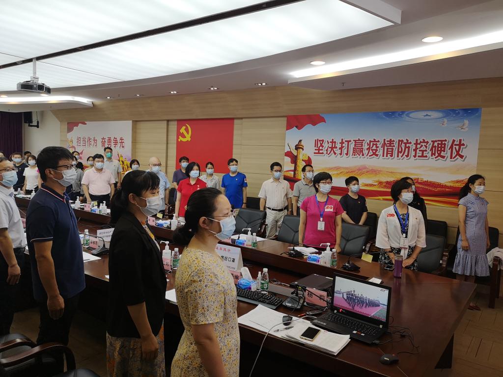 今天上午部分参加疫情防控、患者救治的专家和医护人员在市八医院收看庆祝大会的电视直播实况。