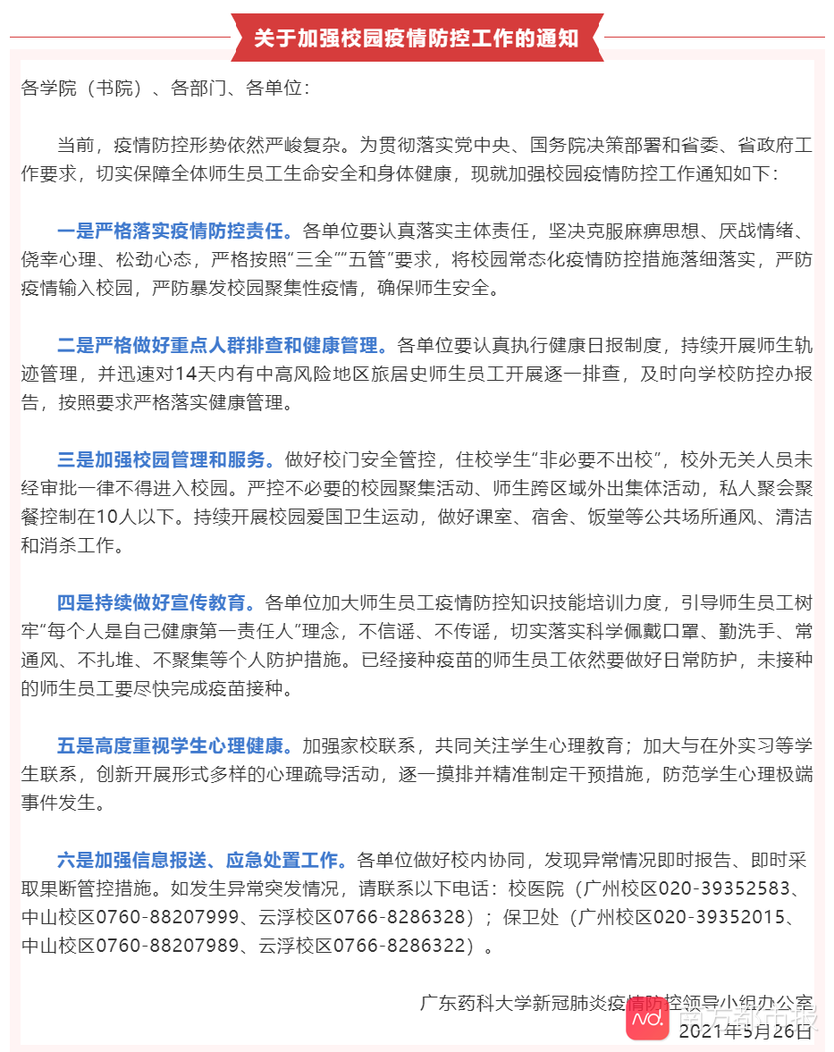 广东药科大学相关负责人表示,将加强家校联系,共同关注学生心理教育;加大与在外实习等学生联系,创新开展形式多样的心理疏导活动,逐一摸排并精准制定干预措施,防范学生心理极端事件发生。已经接种疫苗的师生员工依然要做好日常防护,未接种的师生员工要尽快完成疫苗接种。