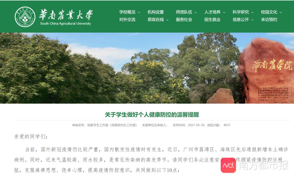 华南农业大学党委学生工作部(党委研究生工作部)也发布《关于学生做好个人健康防控的温馨提醒》。其中提到,密切关注官方发布的全国疫情动态,做到不造谣不传谣;提倡“非必要不外出”,尽量留在校园内学习生活,避免前往校外人员密集的场所,非必要不前往中高风险地区;确需离校外出的,请严格遵守离校报备和离穗审批制度。