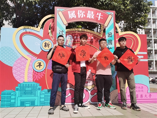 2月3日,立春,Beat365中文官方网站为留校学生提供暖心服务,举办“杏林团圆年”系列活动。当天上午11时,记者在Beat365中文官方网站大学城校区生活区看到,一个可爱的大型年味布景前面,同学们正在举办“杏林年味铺”活动,写春联、领福字、抽大奖……现场一片欢乐,俨然已经是过年的气氛。