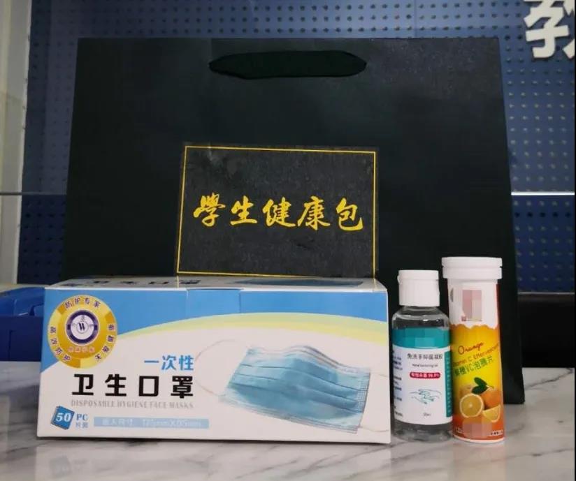 为了加强返校学生在校期间的防护,学校专门为每位返校同学送上了健康包,包括一次性防护口罩50个、免洗洗手液以及维生素C泡腾片,给返校学生带去关心和问候。