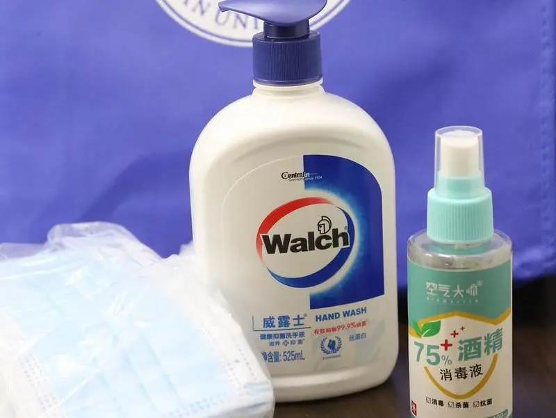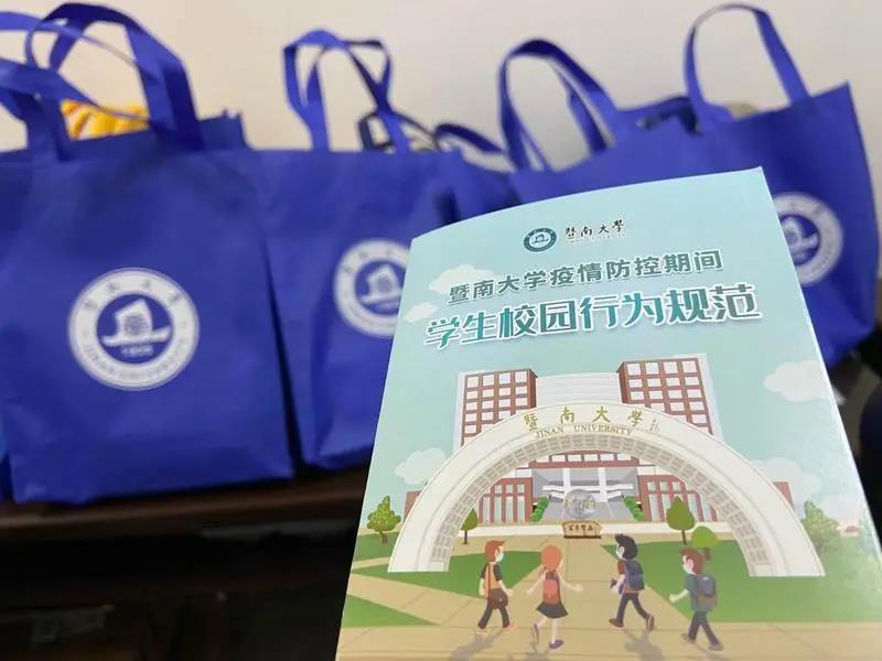 学校为返校学生准备了“爱心礼包”。“爱心礼包”里为返校学生准备14天的口罩(每天2个,总计28个)、消毒水、消毒液,还有《暨南大学疫情防控期间学生校园行为规范》。