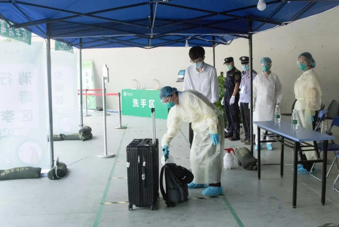 5月11日上午,中山大学各校区(园)工作人员准时到达学生返校通道,迎接2020年春季学期第一批返校学生的到来。学生到校后,由工作人员查验学生的校园卡和健康码校验身份和健康状况,门诊部医生现场测量体温。