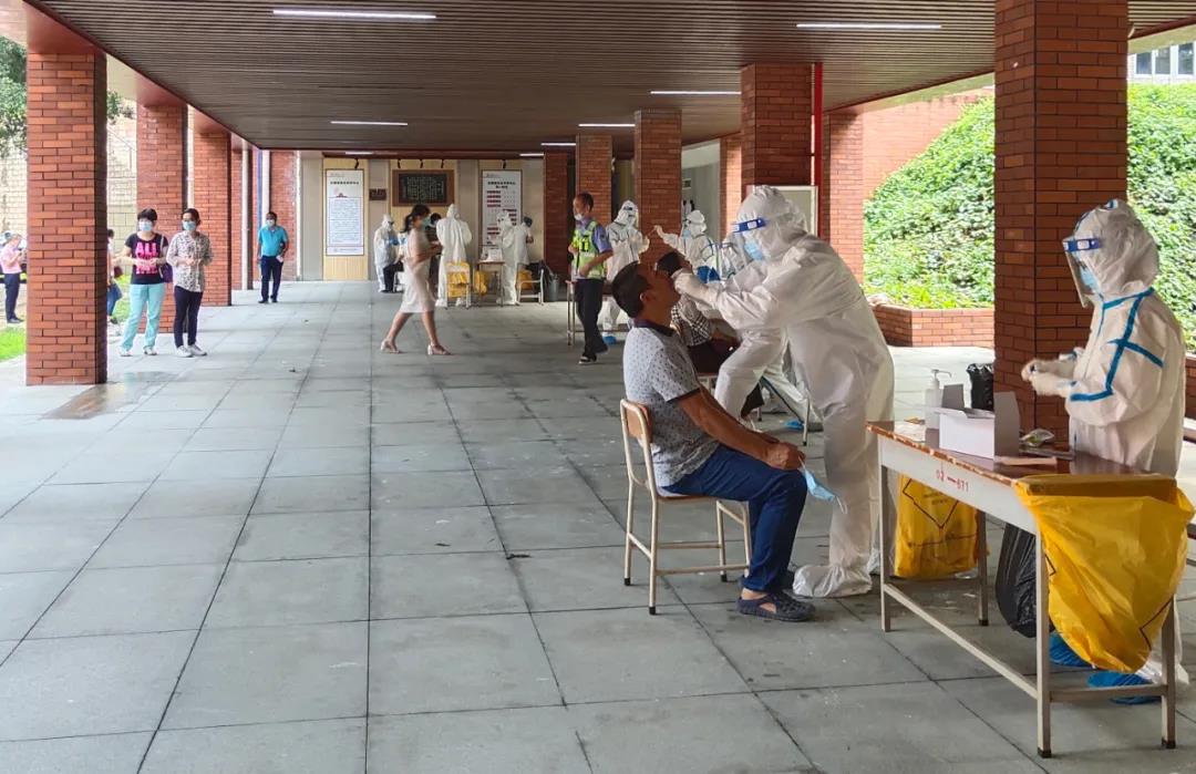 早上8:30,在通风良好的一号楼、五号楼架空层,广州市番禺疗养院的检测人员到位后,全体教职工携带身份证及戴好口罩,按照学校事先安排好的序号,有序来到核酸检测点前,保持好1米的安全距离,排队接受检测。此次检测采用咽拭子的采集方式,医务人员们分工有序,整个过程井然有序。检测完的教职工自觉迅速离开,不扎堆,不聚集。对于此次核酸检测,教职工表示支持和理解,并认为做核酸检测既是保证学生的健康,也是对自己的健康负责,做了核酸检测,让自己心里有底、心中有数。