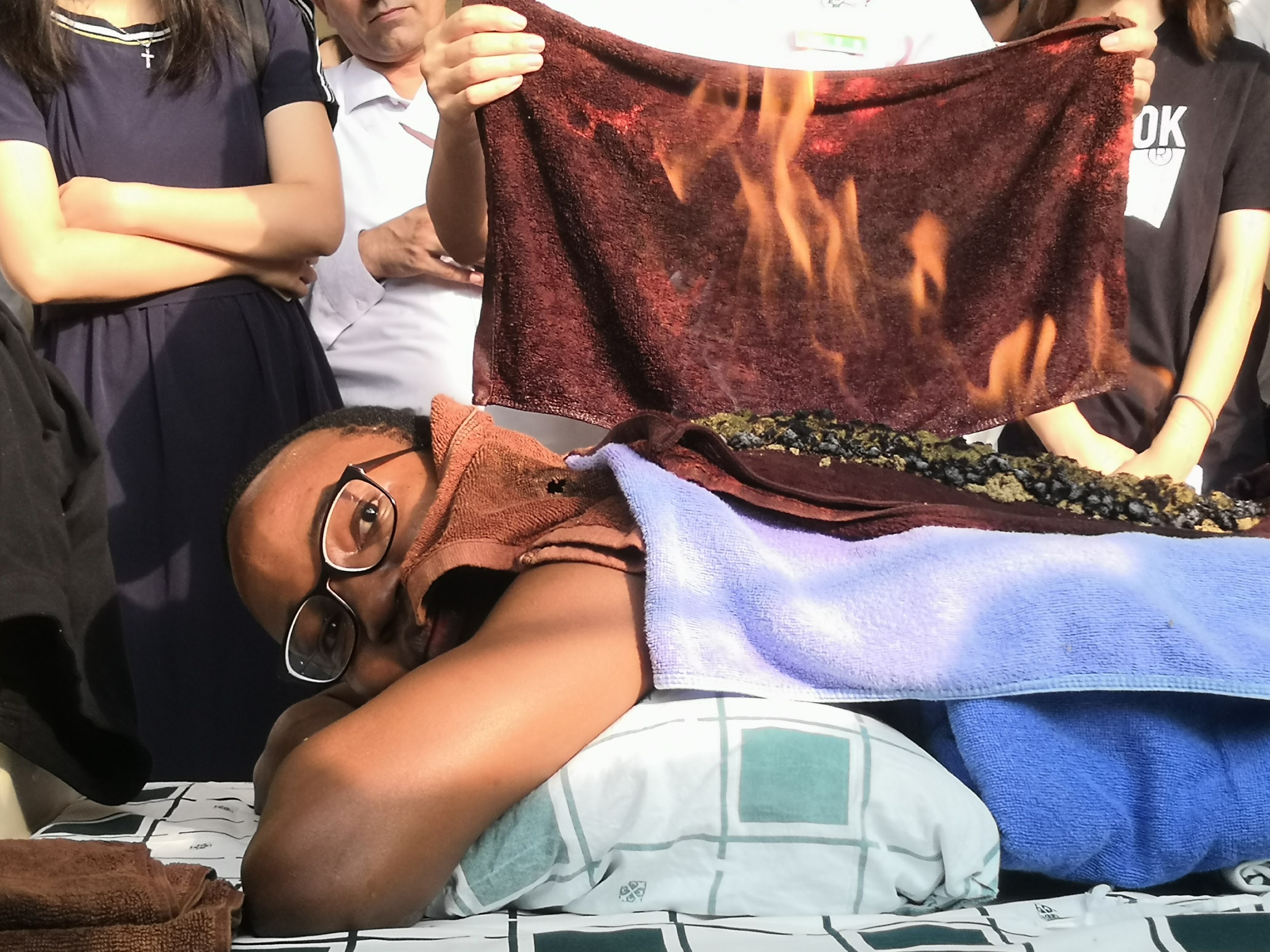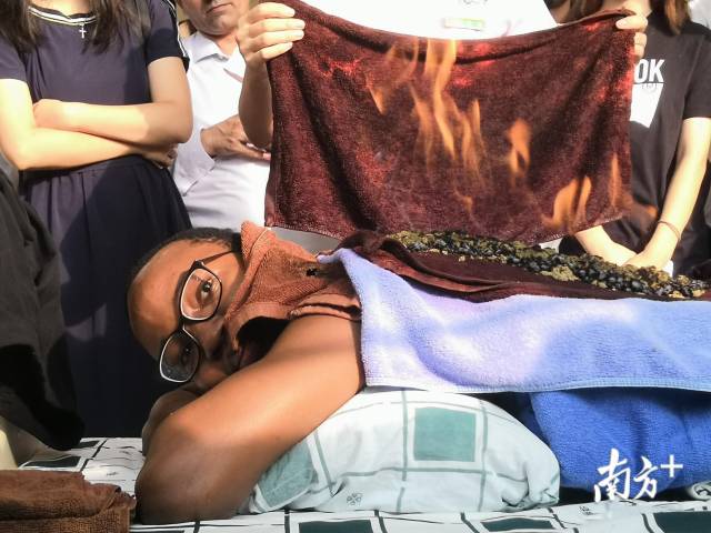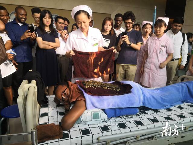 “太神奇了,这是怎么做到的?”来自科特迪瓦的留学生杰米斯趴在床上,背上顶着一团火焰,不知道的路人还以为着了火。但杰米斯表情轻松,面挂微笑。原来,他正在体验中医传统疗法——火龙灸。