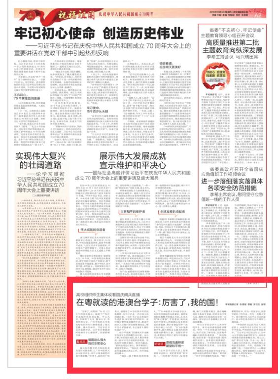 中山大学社会学与人类学学院学生、来自中国香港的陈添辉说:“作为一个在内地读书的香港人,我们比较了解内地,应该做香港和内地的沟通桥梁。”国庆假期,他打算看一场爱国电影《我和我的祖国》,也希望回到香港后,给亲朋好友、中学的师弟师妹们讲在内地的所见所闻,让他们更加了解祖国。