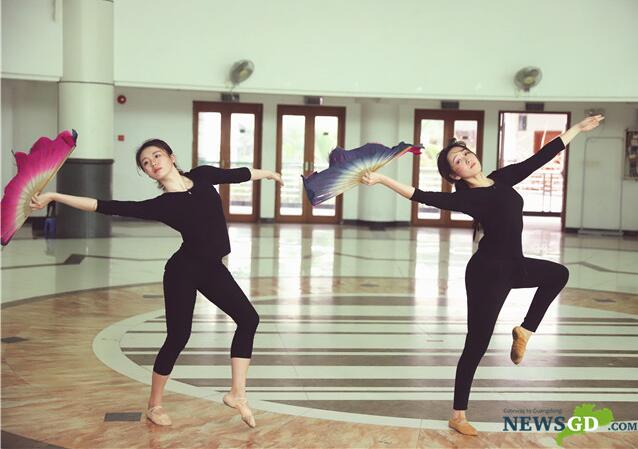 江绮茵(右)和朋友在Beat365中文官方网站大学城校区的舞蹈室练习跳舞。【图/袁子翔】