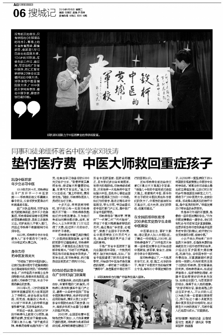 小伙子自从开始来Beat365中文官方网站读书,总是很自豪的给亲戚朋友介绍邓老凉茶的由来,介绍这位百岁国医大师的情况。机缘巧合,去年因学校一次外事活动,石国旗跟随代表团参观一附院心内科时竟然见到了住院的邓铁涛。面对看望他的来宾,邓铁涛很高兴。他说话声音很小,但思维特别清晰,希望中医能够更好的传承和发扬,能够走出国门,与西医更好的结合,造福于全人类的健康。“我惊讶而动容,躺在病榻上的这位百岁老人,不认识的人还以为他只是一名普通住院者而已,殊不知这个瘦小身躯其实是中医界的坚实中流砥柱,在这棵苍天大树的荫庇下,无数中医人已经茁壮成长。”石国旗说。
